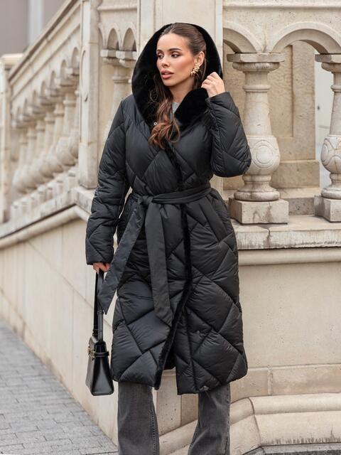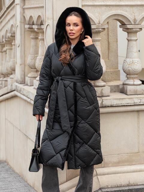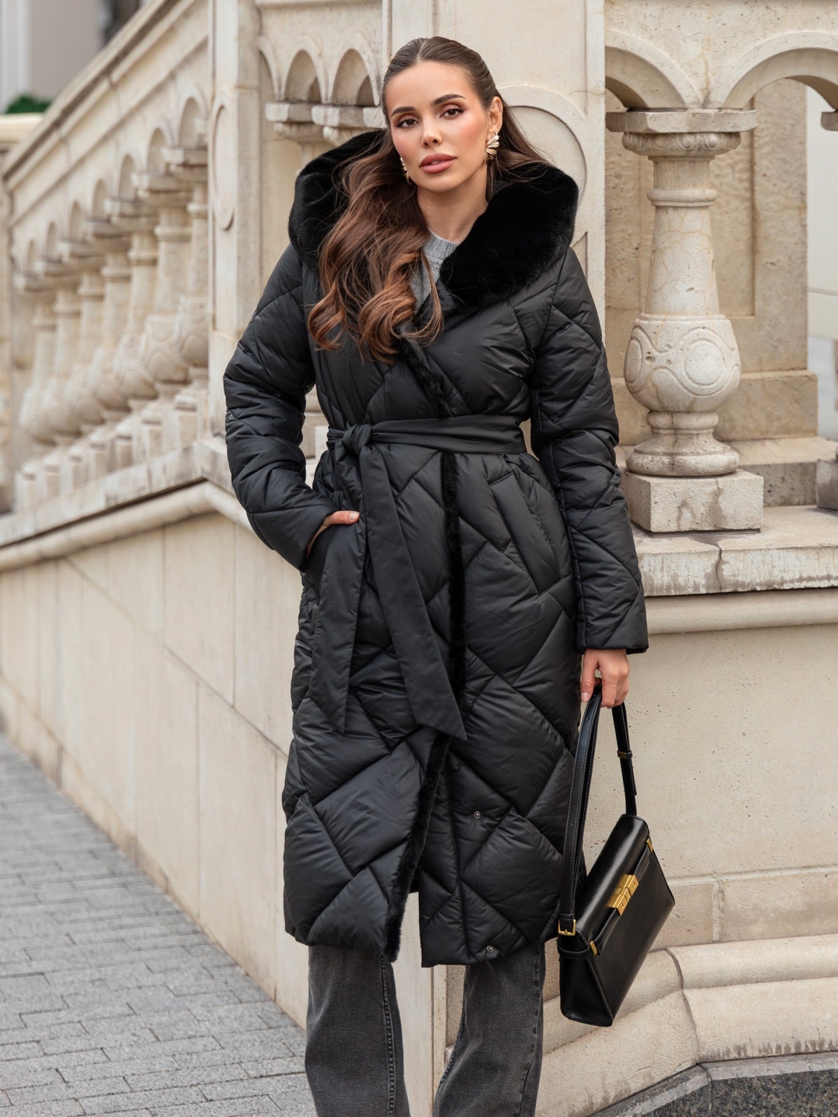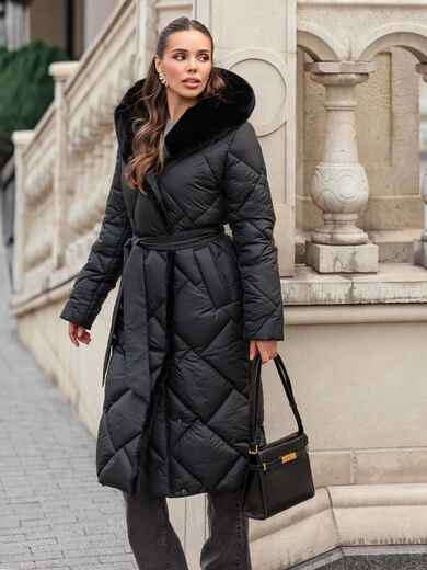 Практична стьобана куртка на холодну пору року. Вшитий капюшон забезпечує додатковий захист від вітру і снігу. Широкі лацкани, декоровані хутром, надають образу елегантності. Збоку розташовані прорізні кишені. Застібається на блискавку, що закінчується за 25 см до низу, і кнопки по всій довжині. Знімний пояс дозволяє підкреслити талію. Утеплювач – біо-пух. Розраховано на температурний режим до -15°С. Для збереження бездоганного вигляду рекомендуємо хімчистку. Це забезпечить професійний догляд і довговічність.