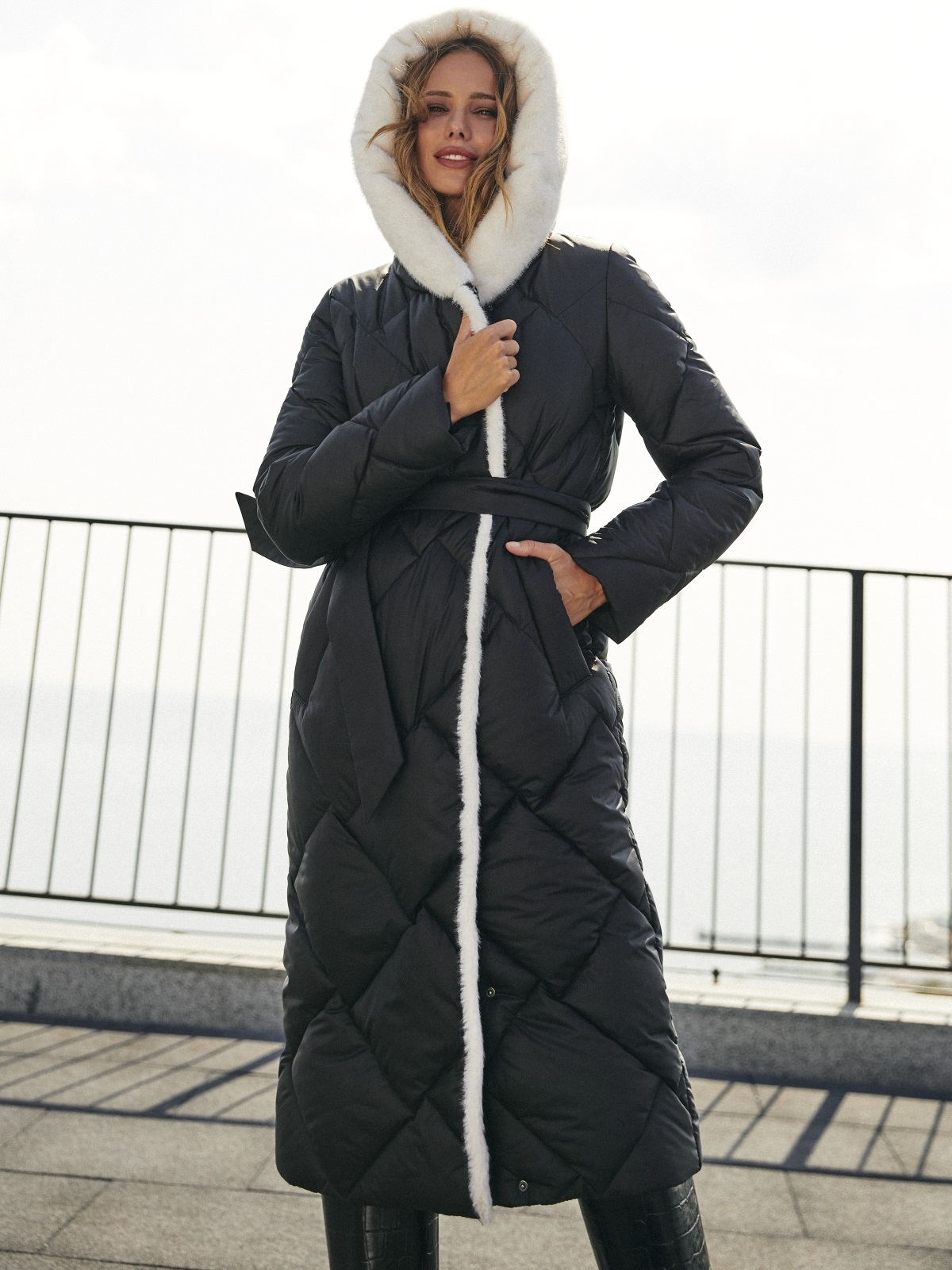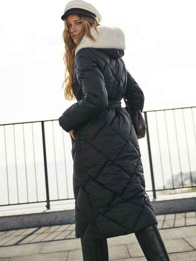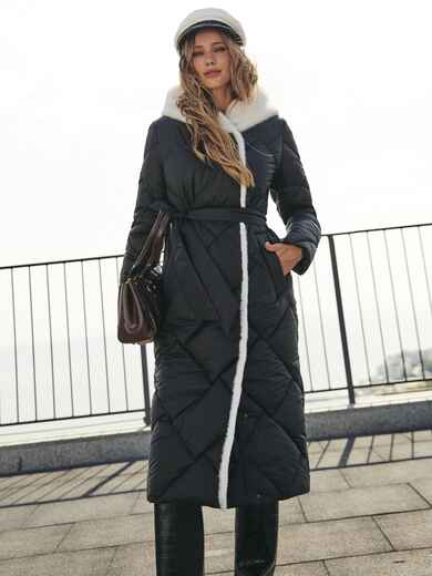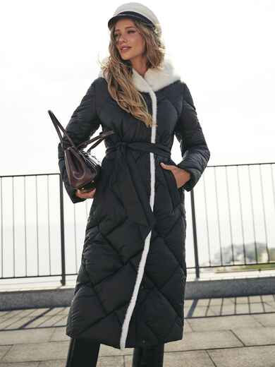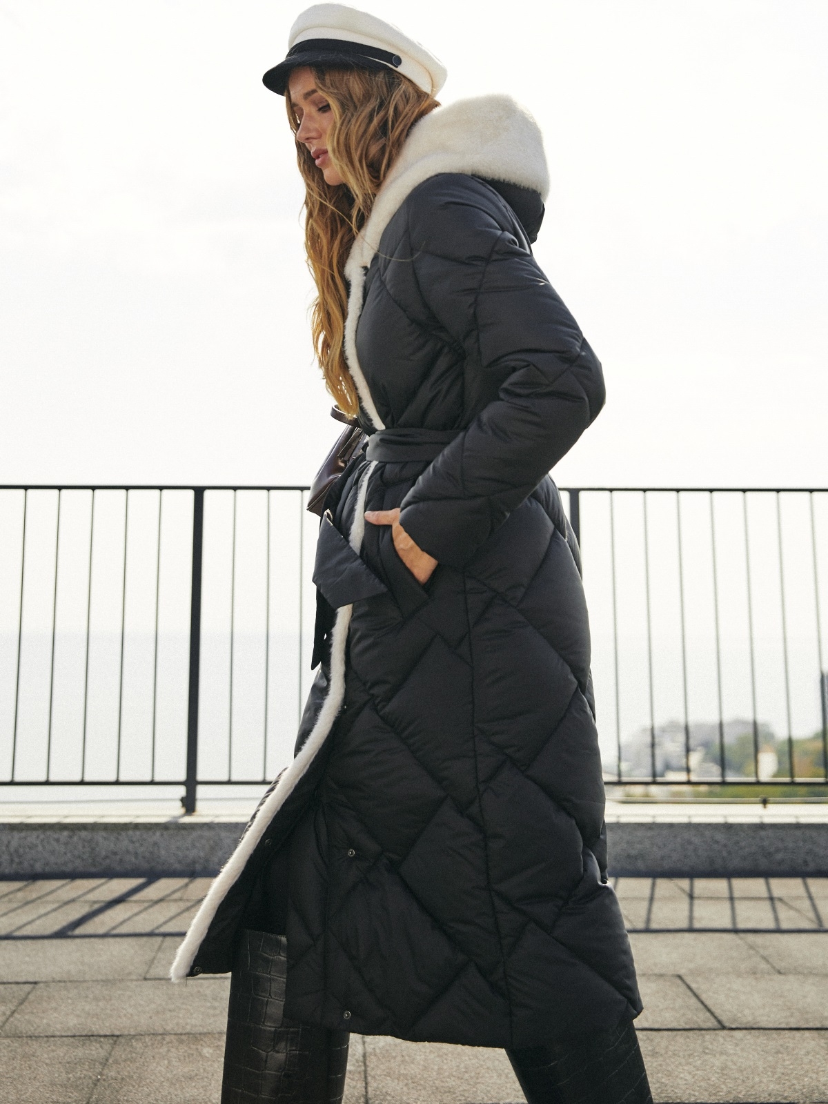 Практична стьобана куртка на холодну пору року. Вшитий капюшон забезпечує додатковий захист від вітру і снігу. Широкі лацкани, декоровані хутром, надають образу елегантності. Збоку розташовані прорізні кишені. Застібається на блискавку, що закінчується за 25 см до низу, і кнопки по всій довжині. Знімний пояс дозволяє підкреслити талію. Утеплювач – біо-пух. Розраховано на температурний режим до -15°С. Для збереження бездоганного вигляду рекомендуємо хімчистку. Це забезпечить професійний догляд і довговічність.