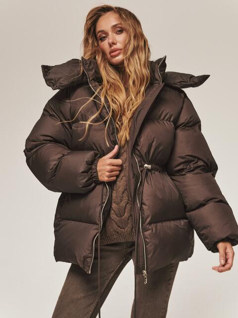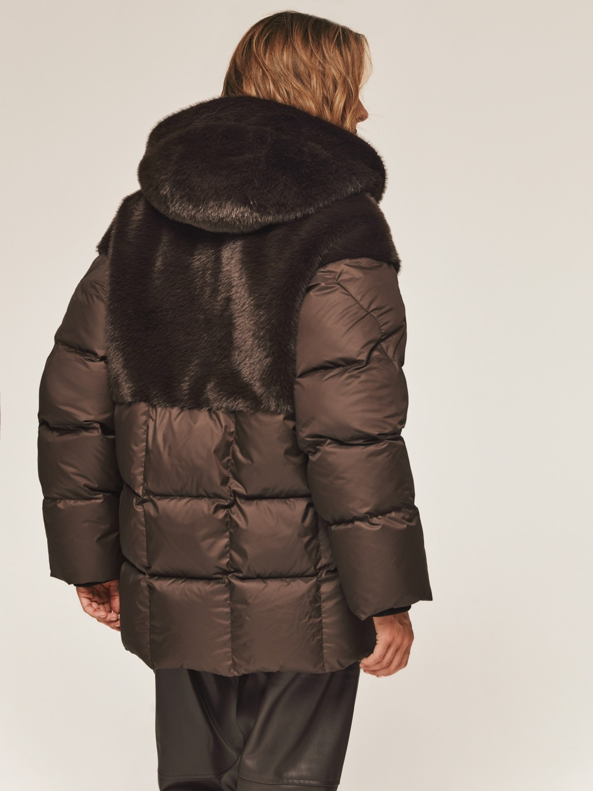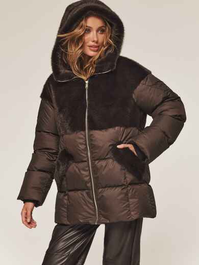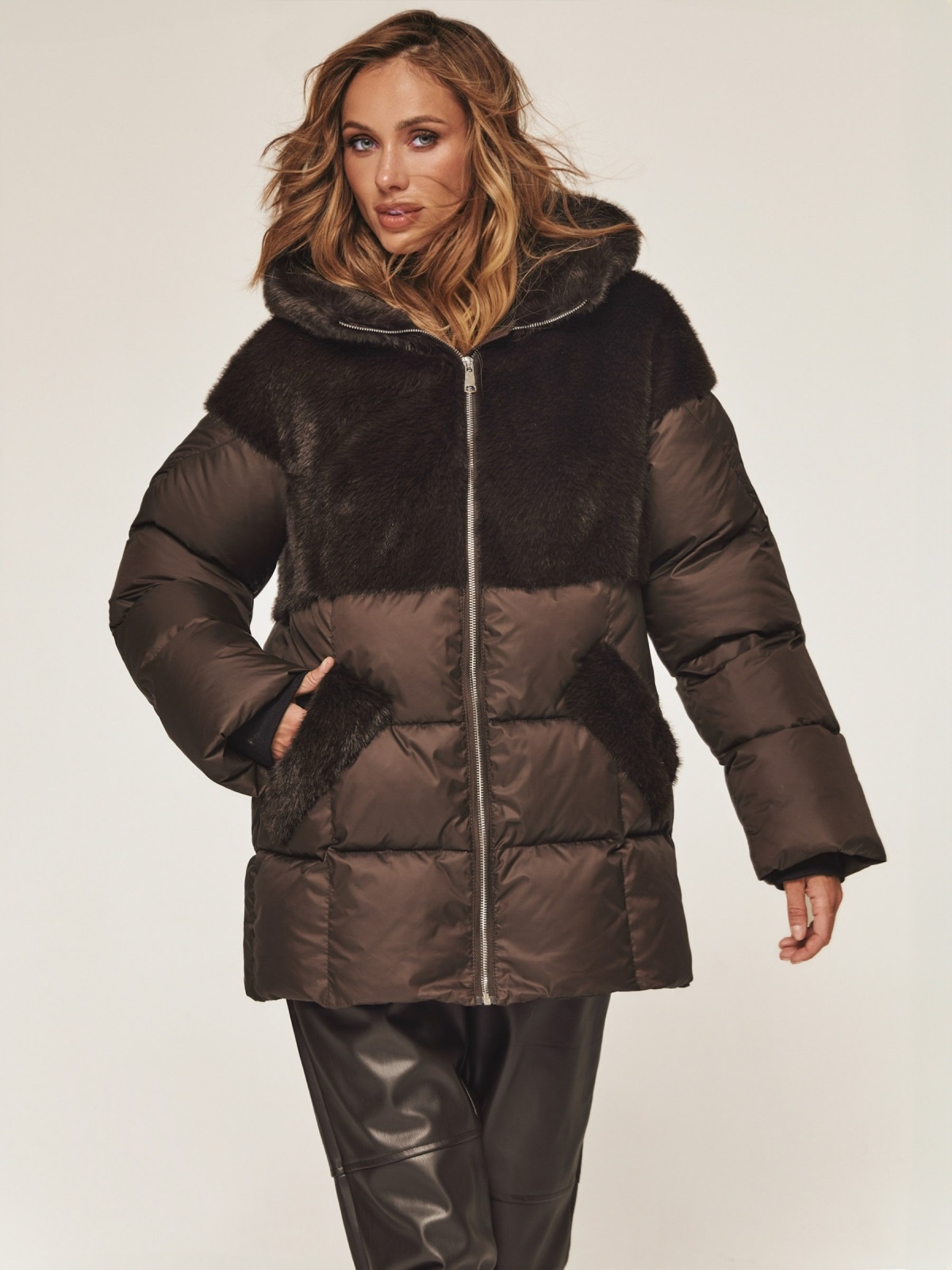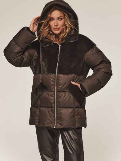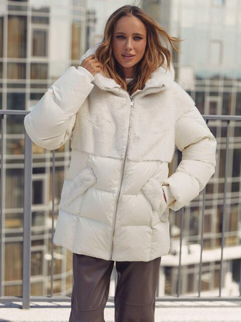 Незвичайна зимова куртка. Модель поєднує класичний стьобаний крій зі вставками з штучного хутра норки, розташованими на грудях, спині та в області кишень із застібкою на кнопки. Вшитий капюшон з хутром захистить від вітру та снігу. Внутрішні манжети на рукавах забезпечують додатковий захист від холоду. Низ з внутрішньої сторони регулюється гумкою з фіксатором. З внутрішньої сторони розташована накладна кишеня. Застібка-блискавка робить виріб практичним для щоденного використання. Утеплювач – біопух. Розраховано на температурний режим до -15°С.