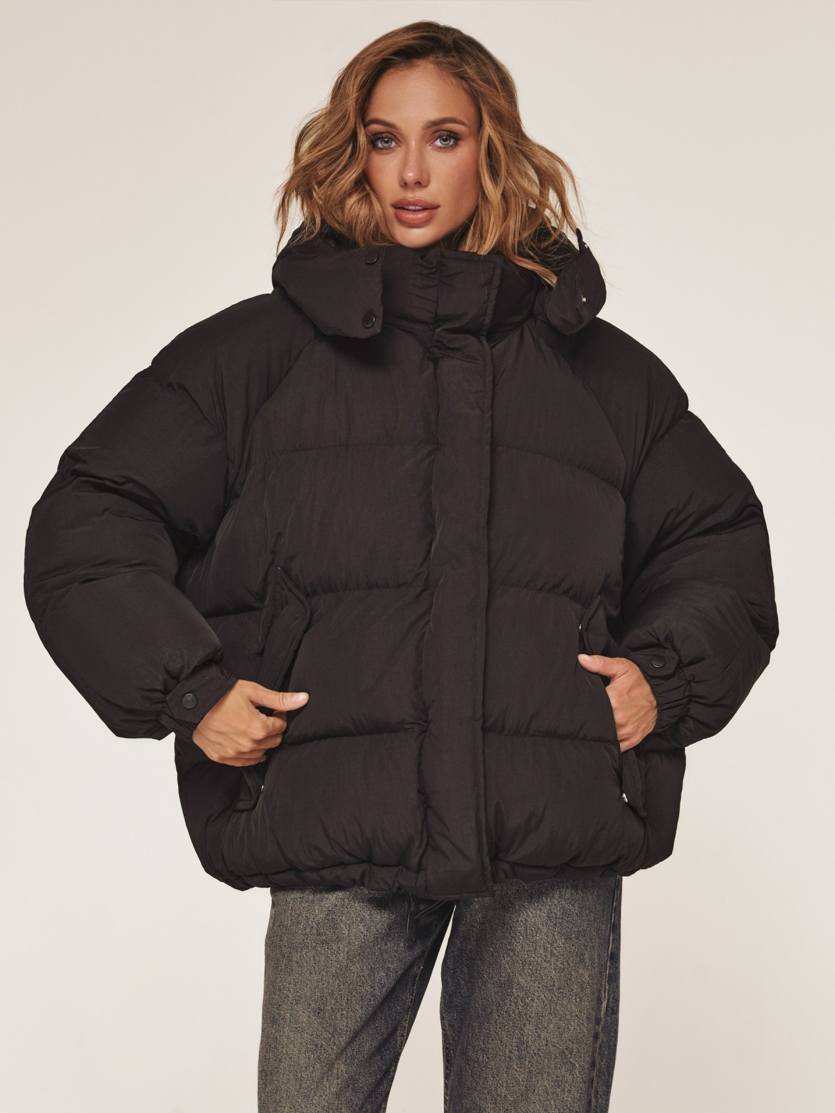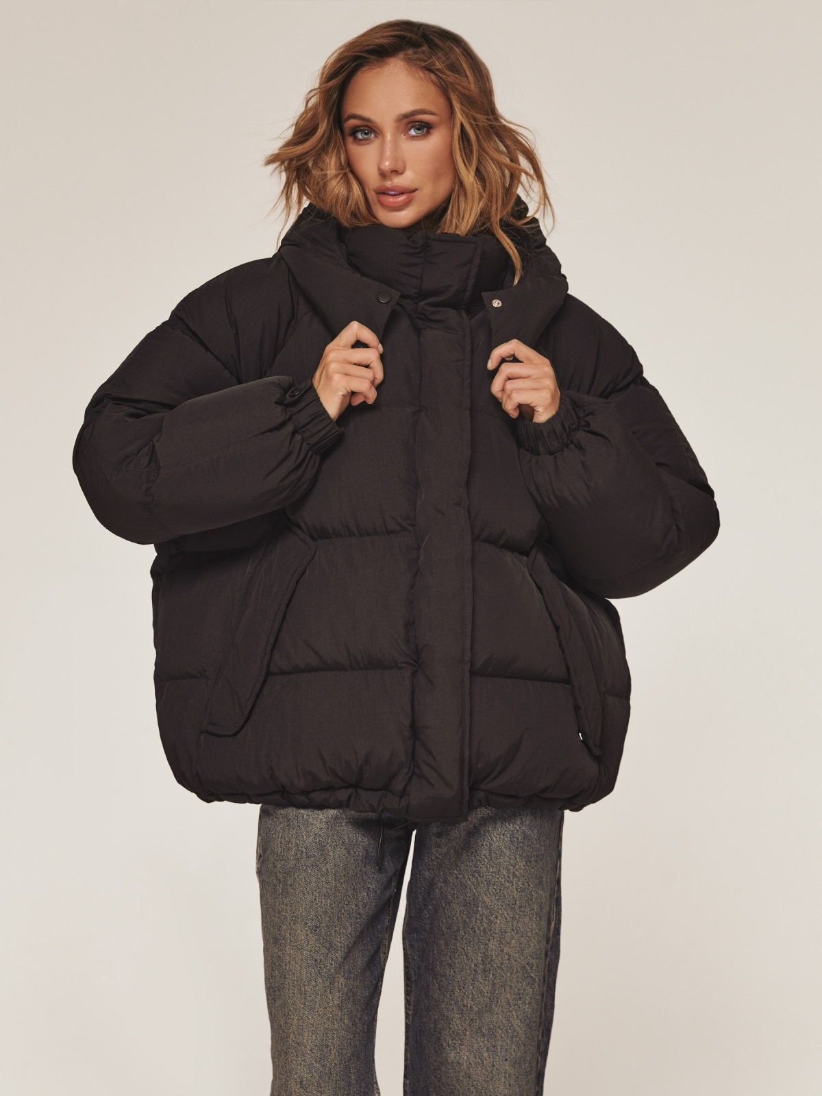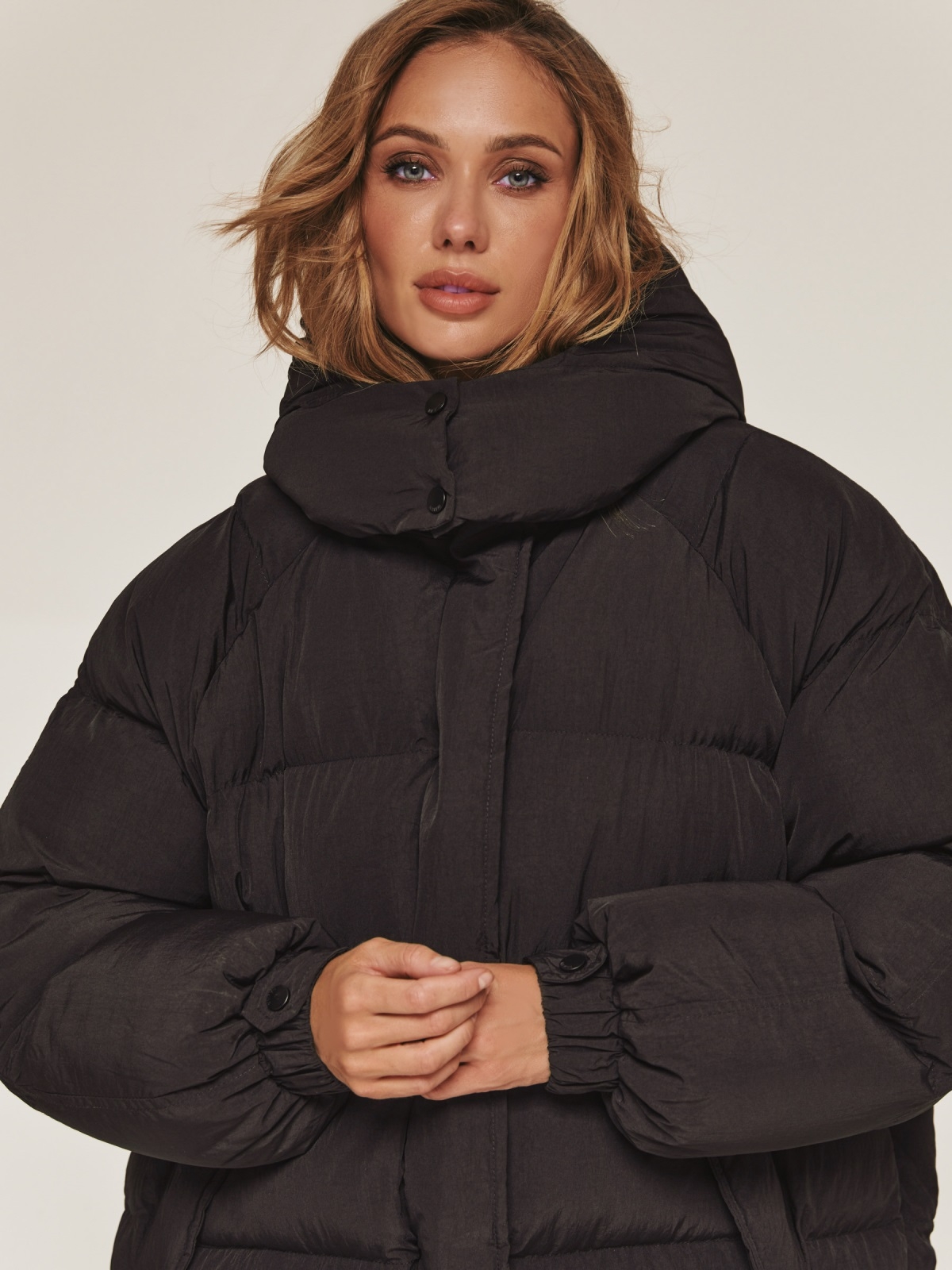 Об'ємна стьобана куртка. Модель з жатої плащівки «краш». Наповнювач - біопух, інноваційний синтетичний матеріал, який прекрасно зберігає тепло і витримує температуру до -20°C. Капюшон відстібається. Комір-стійка фіксується кнопками для додаткового тепла. Довгі рукави з манжетами на гумці і кнопці забезпечують щільне прилягання. Низ куртки регулюється за допомогою куліски. Прорізні кишені з клапанами на кнопках. Застібається на блискавку і кнопки.