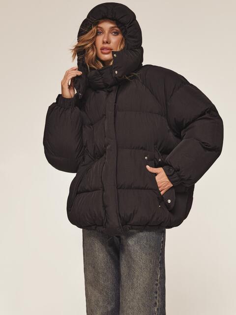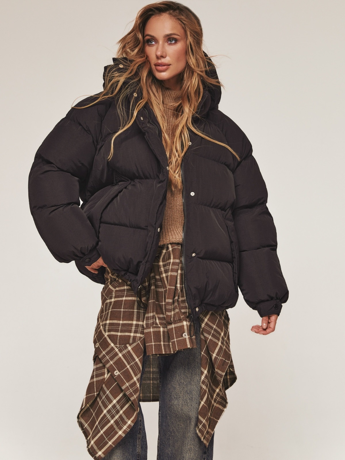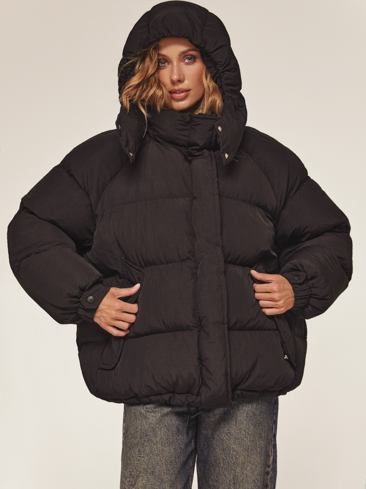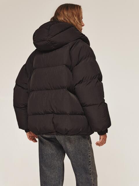 Об'ємна стьобана куртка. Модель з жатої плащівки «краш». Наповнювач - біопух, інноваційний синтетичний матеріал, який прекрасно зберігає тепло і витримує температуру до -20°C. Капюшон відстібається. Комір-стійка фіксується кнопками для додаткового тепла. Довгі рукави з манжетами на гумці і кнопці забезпечують щільне прилягання. Низ куртки регулюється за допомогою куліски. Прорізні кишені з клапанами на кнопках. Застібається на блискавку і кнопки.