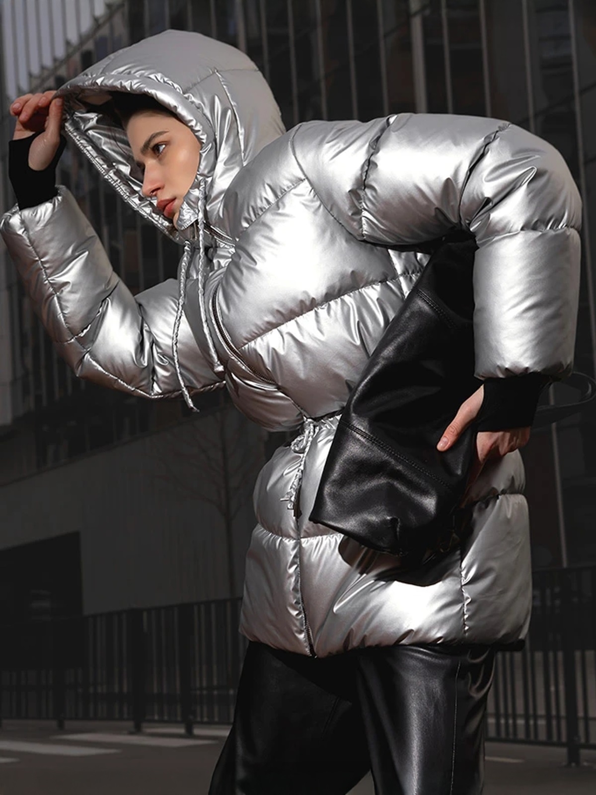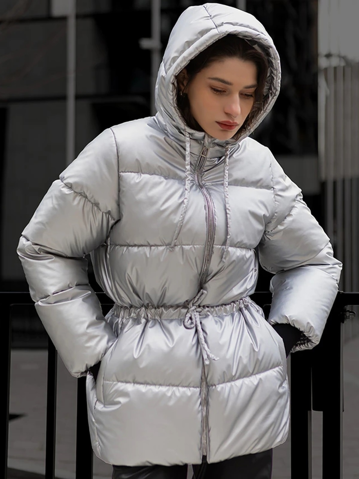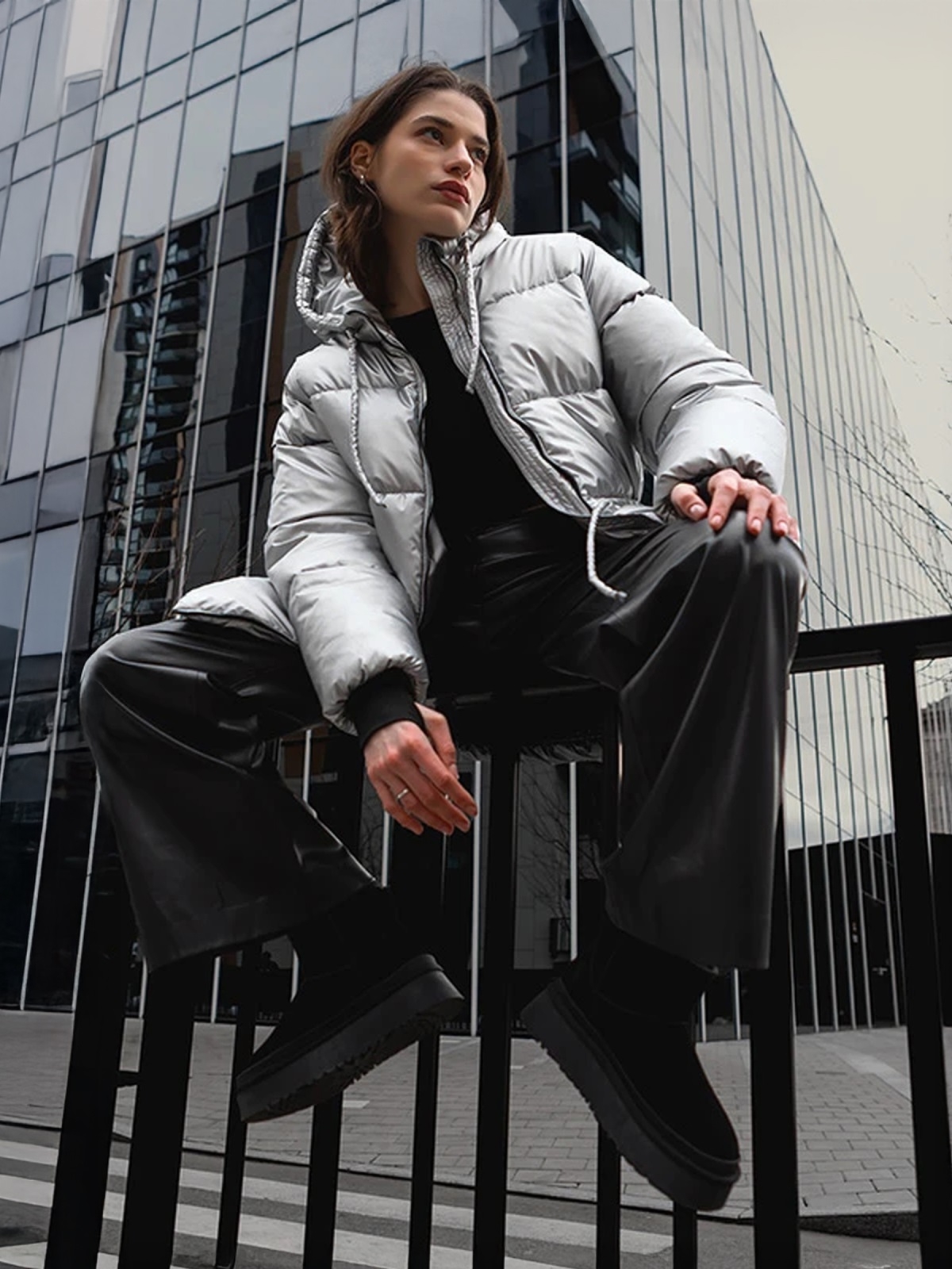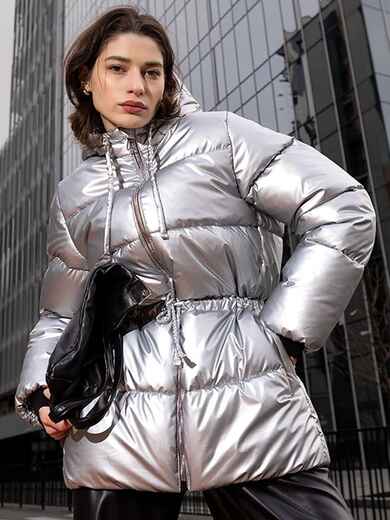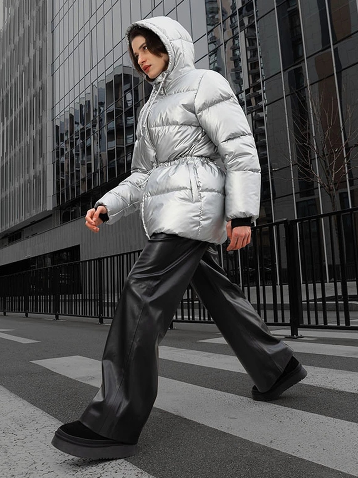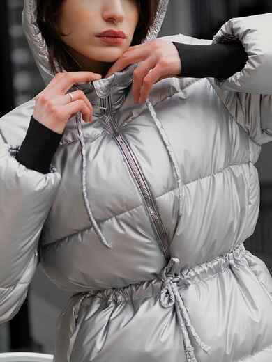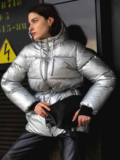 Вкорочена стьобана куртка з глянцевої плащової тканини. Доповнена вшитим капюшоном і високим коміром-стійкою. Талія регулюється куліскою зі шнурком, що дозволяє підлаштовувати посадку по фігурі. Застібається на блискавку. Наповнювач - екопух. Розраховано на температурний режим до -15 ° С.