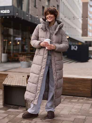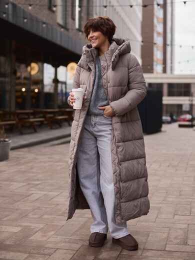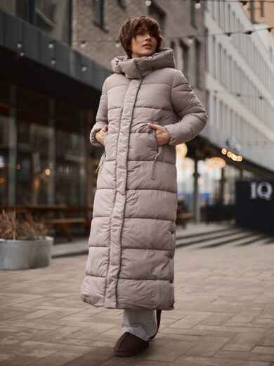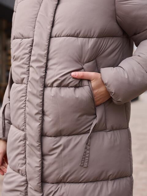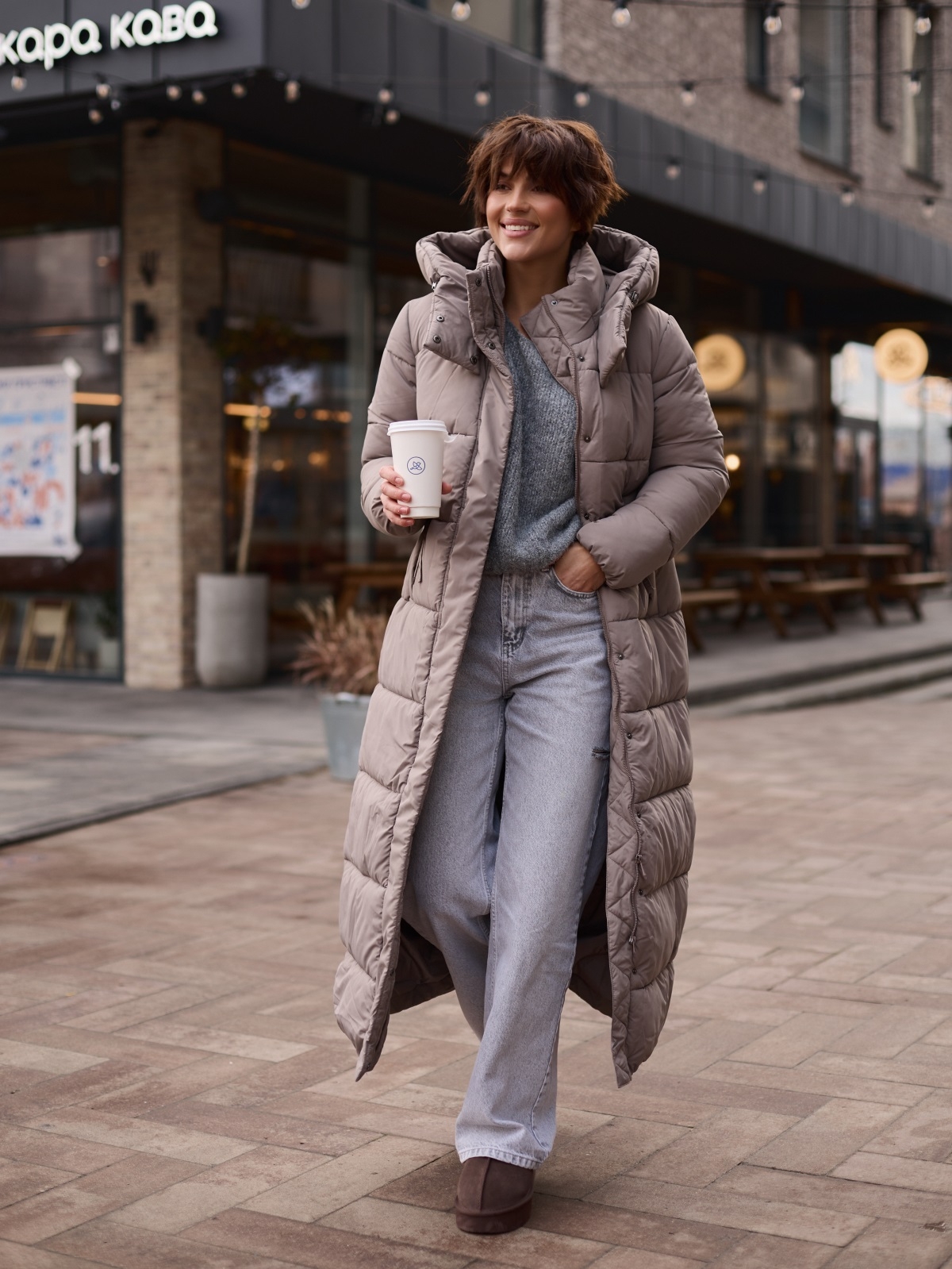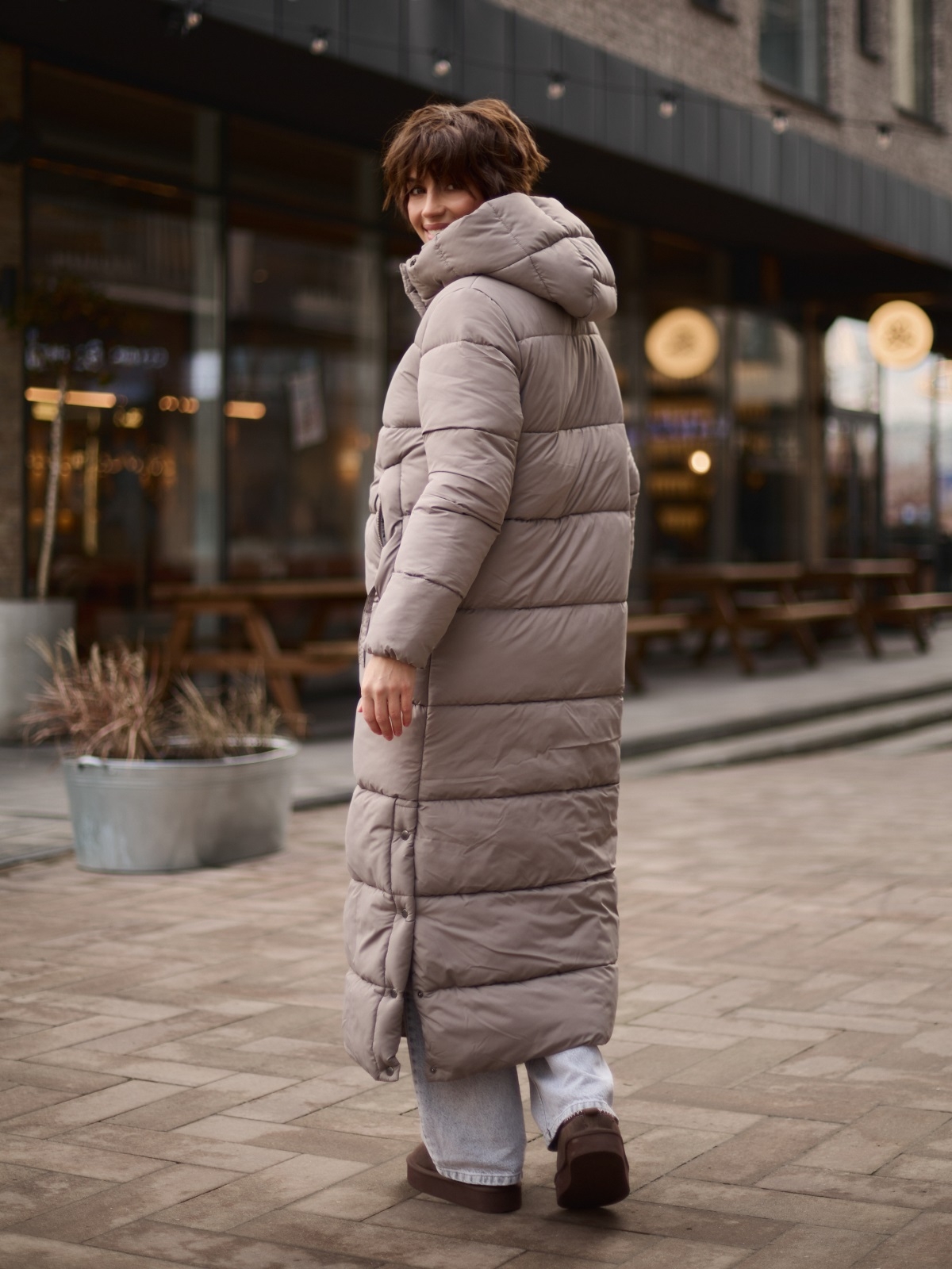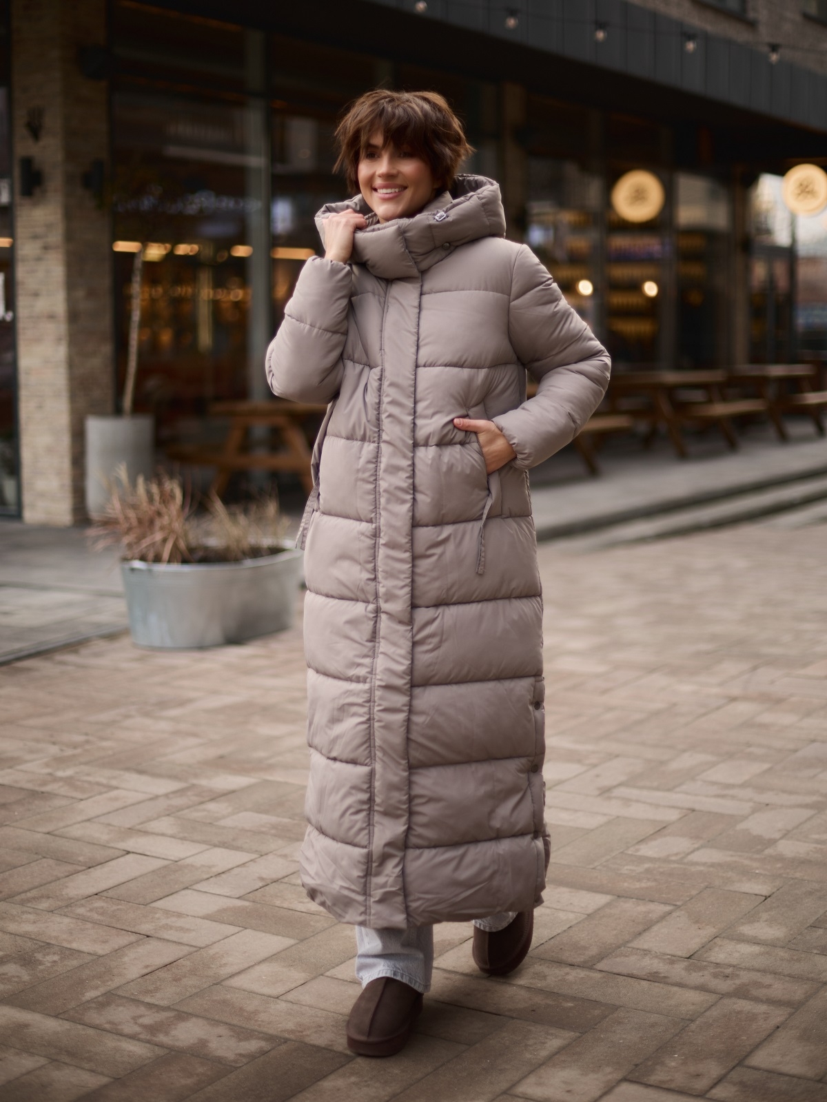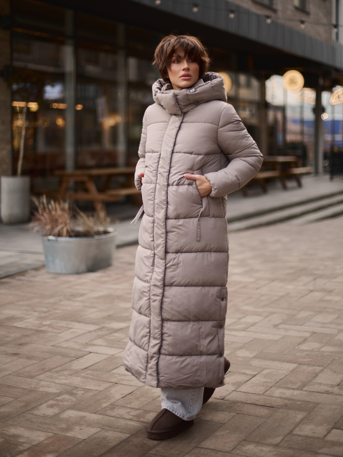 Стьобана куртка довгого крою. Модель зі знімним капюшоном з регуляторами. Для комфорту доповнена двома кишенями зверху та однією всередині виробу. Збоку розрізи на функціональних кнопках. Застібається на блискавку по всій довжині, яка прихована під планкою на кнопках для додаткового захисту від вітру і холоду. Наповнювач — біопух, зберігає тепло і витримує температуру до -25°C.