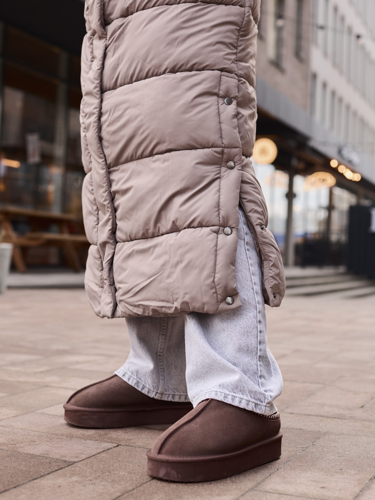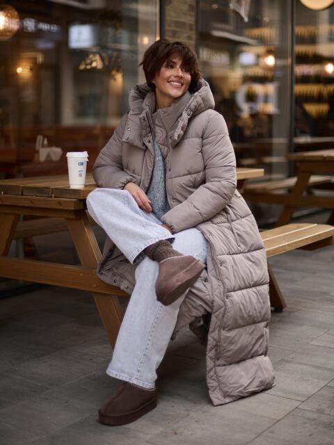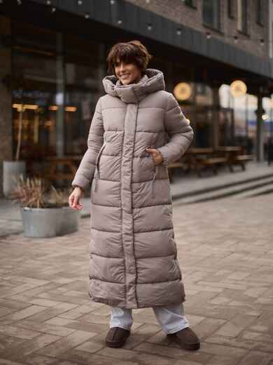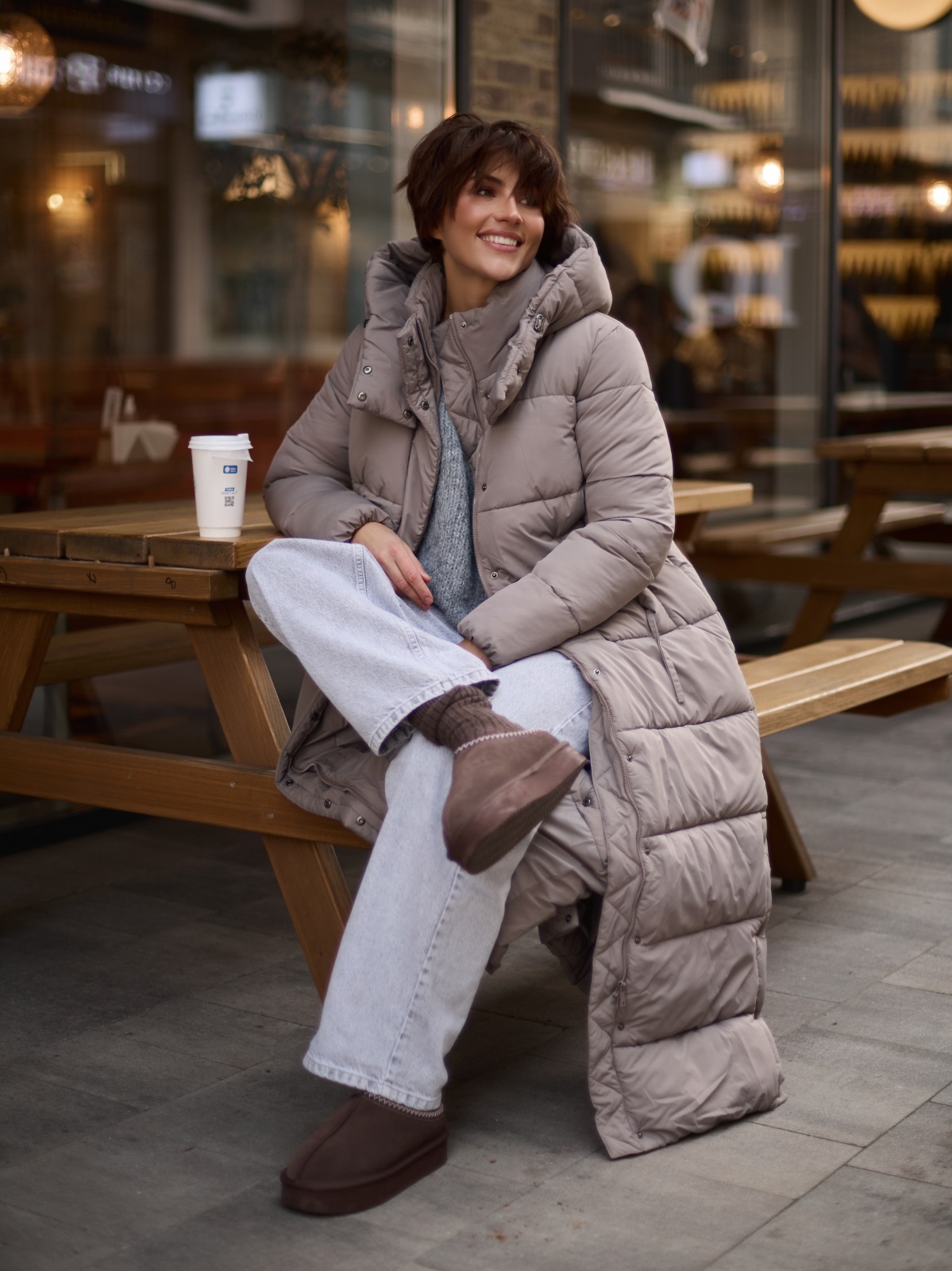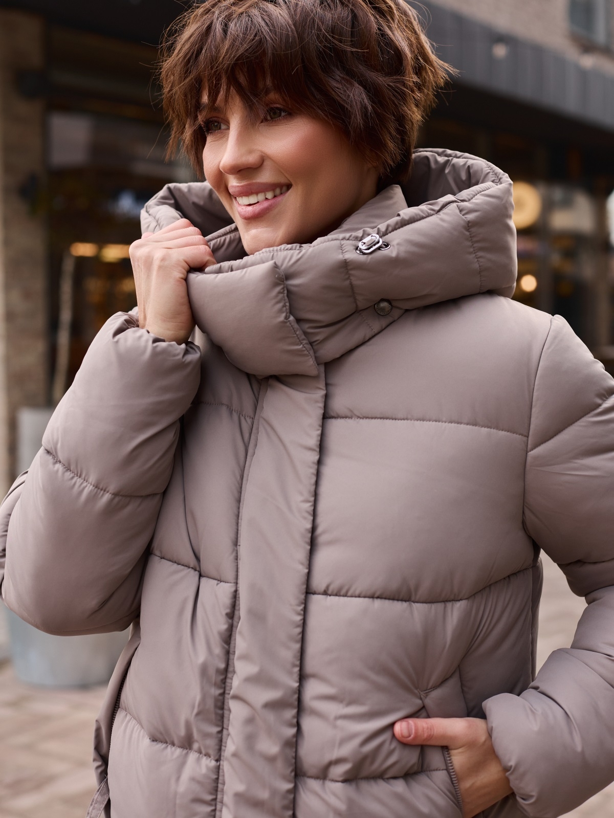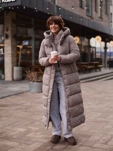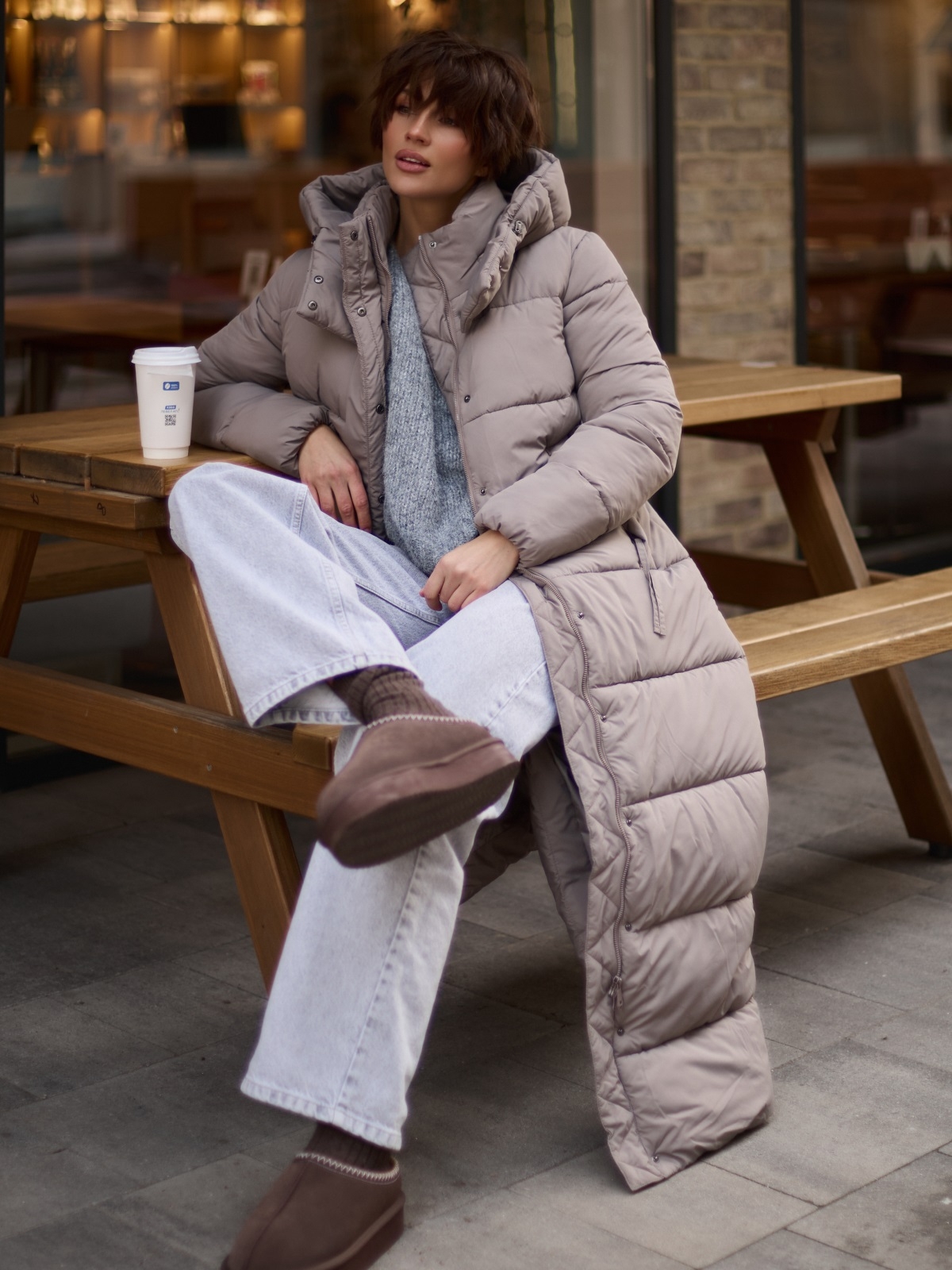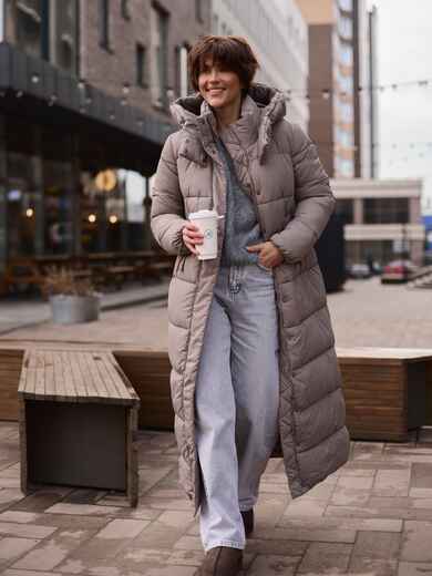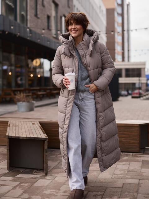 Стьобана куртка довгого крою. Модель зі знімним капюшоном з регуляторами. Для комфорту доповнена двома кишенями зверху та однією всередині виробу. Збоку розрізи на функціональних кнопках. Застібається на блискавку по всій довжині, яка прихована під планкою на кнопках для додаткового захисту від вітру і холоду. Наповнювач — біопух, зберігає тепло і витримує температуру до -25°C.