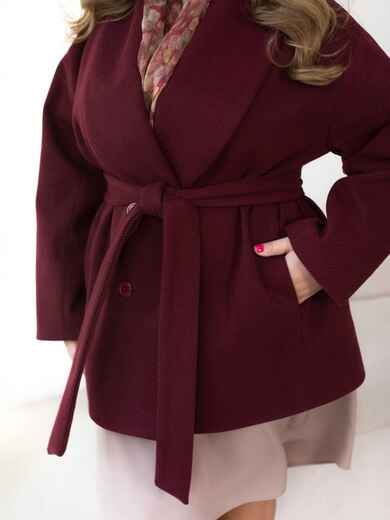 Демісезонне пальто із щільного кашеміру. Модель на підкладці. З відкладним коміром та довгими рукавами. Доповнено прорізними кишенями. Застібається на ґудзики. Комплектується текстильним паском.