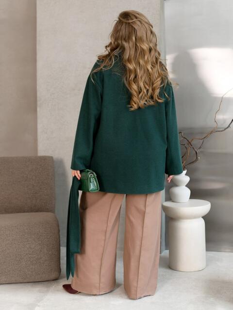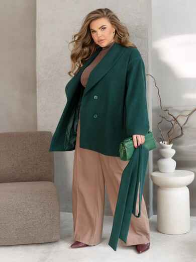 Демісезонне пальто із щільного кашеміру. Модель на підкладці. З відкладним коміром та довгими рукавами. Доповнено прорізними кишенями. Застібається на ґудзики. Комплектується текстильним паском.