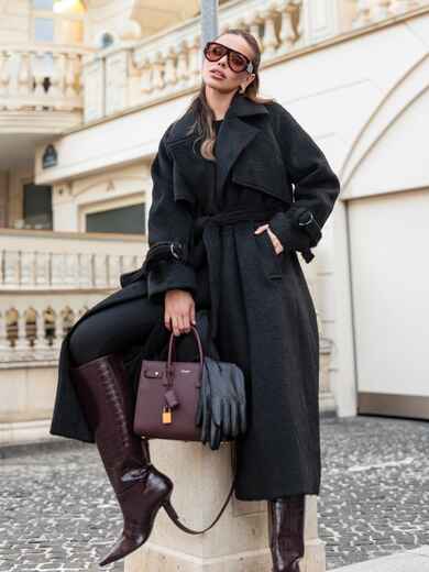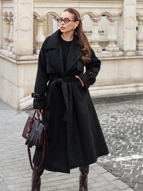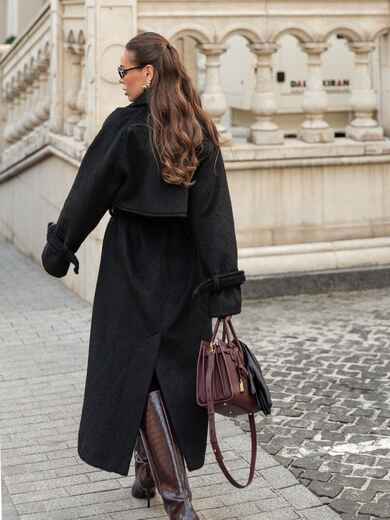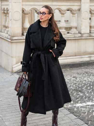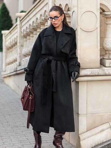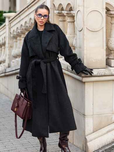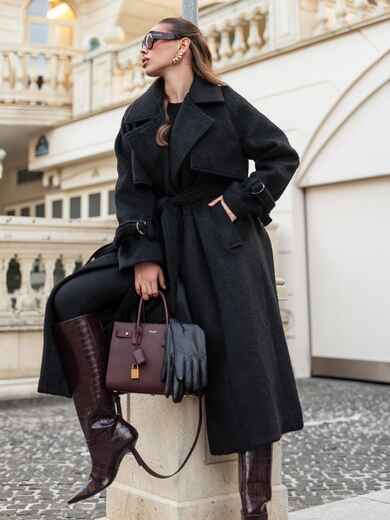 Пальто на запах з підкладкою. Завдяки вільному крою і спущеним плечам, воно не сковує рухів. Довгі рукави доповнені ремінцем із пряжкою для фіксації. Текстура тканини з легким ворсом надає виробу об'єм і м'якість, роблячи його приємним на дотик і візуально привабливим. Класичний фасон з широкими лацканами надає сучасний вигляд. З кишенями збоку. Для комфорту в носінні ззаду розташований розріз. Комплектується поясом. Розраховано на температурний режим від +10°C до 0°C.