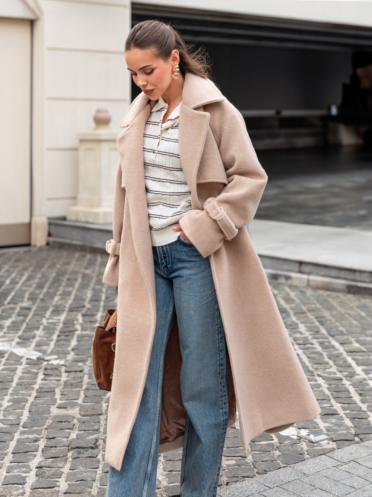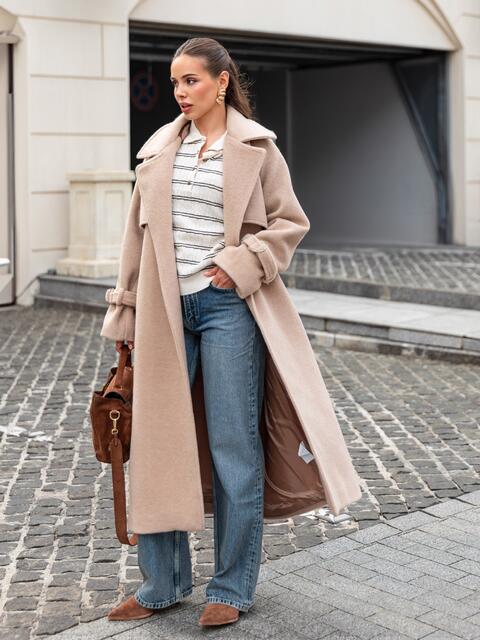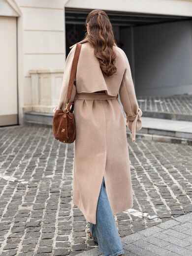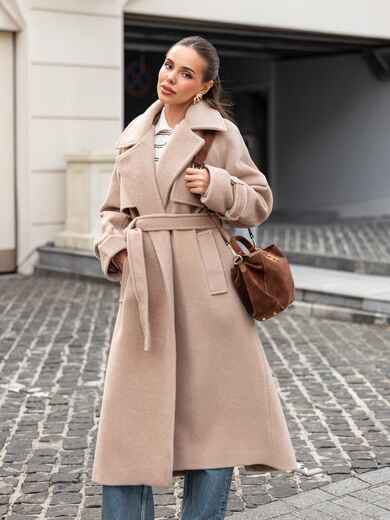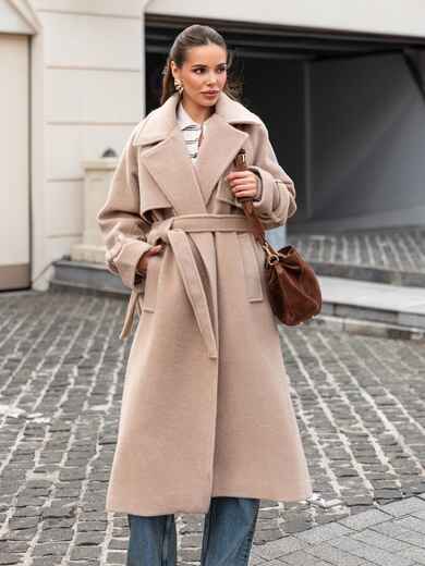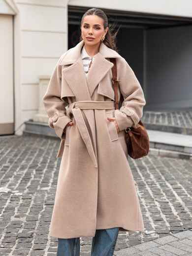Пальто на запах з підкладкою. Завдяки вільному крою і спущеним плечам, воно не сковує рухів. Довгі рукави доповнені ремінцем із пряжкою для фіксації. Текстура тканини з легким ворсом надає виробу об'єм і м'якість, роблячи його приємним на дотик і візуально привабливим. Класичний фасон з широкими лацканами надає сучасний вигляд. З кишенями збоку. Для комфорту в носінні ззаду розташований розріз. Комплектується поясом. Розраховано на температурний режим від +10°C до 0°C.
