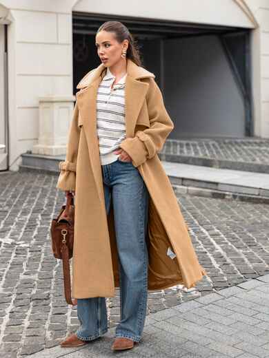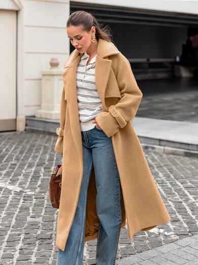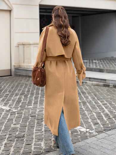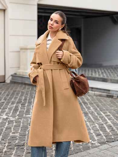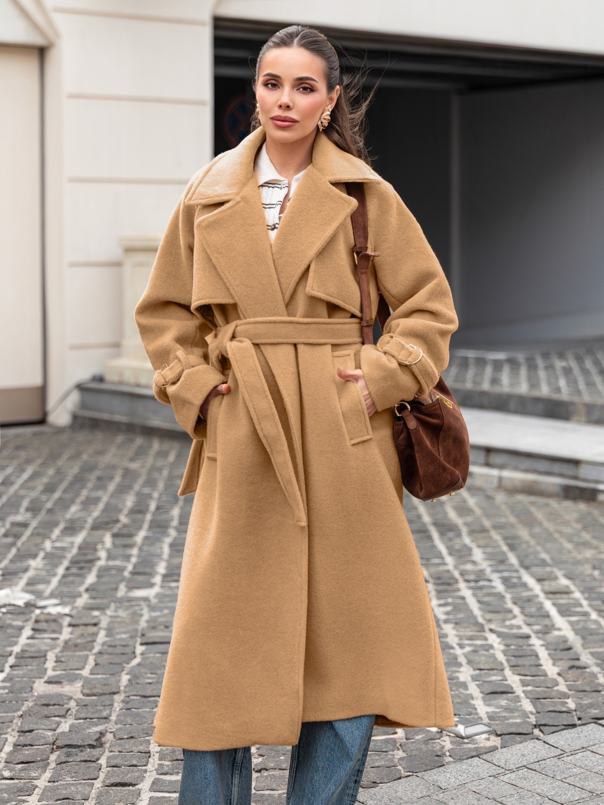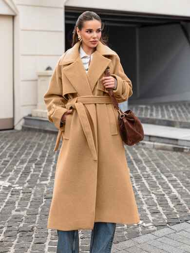 Пальто на запах з підкладкою. Завдяки вільному крою і спущеним плечам, воно не сковує рухів. Довгі рукави доповнені ремінцем із пряжкою для фіксації. Текстура тканини з легким ворсом надає виробу об'єм і м'якість, роблячи його приємним на дотик і візуально привабливим. Класичний фасон з широкими лацканами надає сучасний вигляд. З кишенями збоку. Для комфорту в носінні ззаду розташований розріз. Комплектується поясом. Розраховано на температурний режим від +10°C до 0°C.