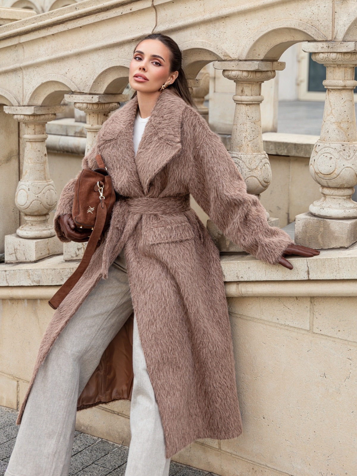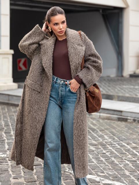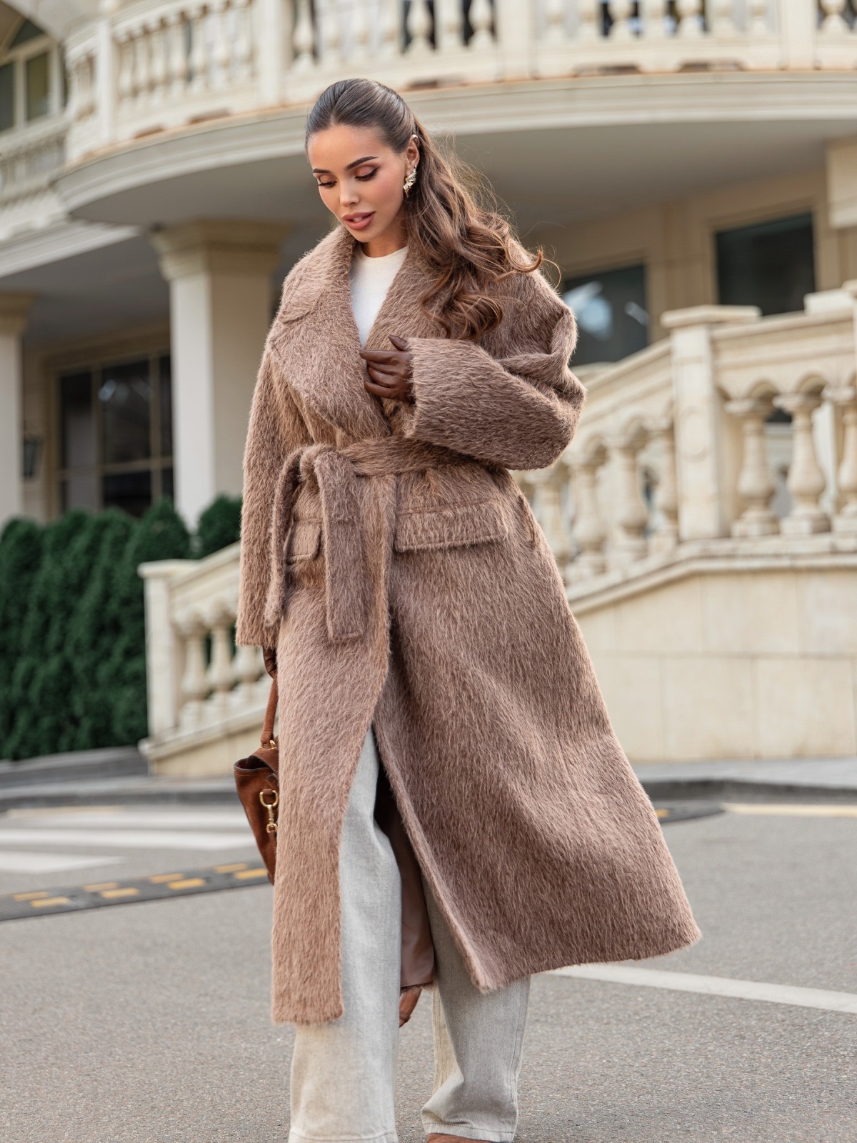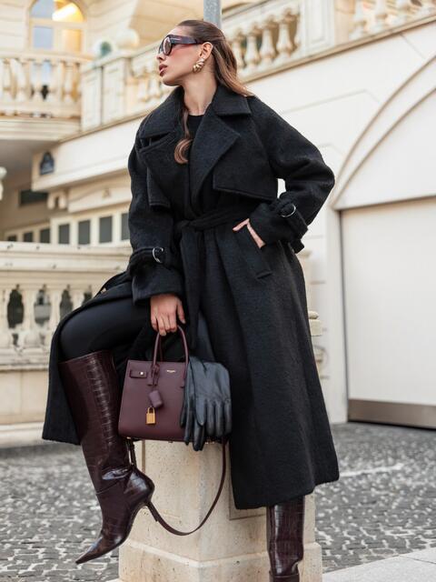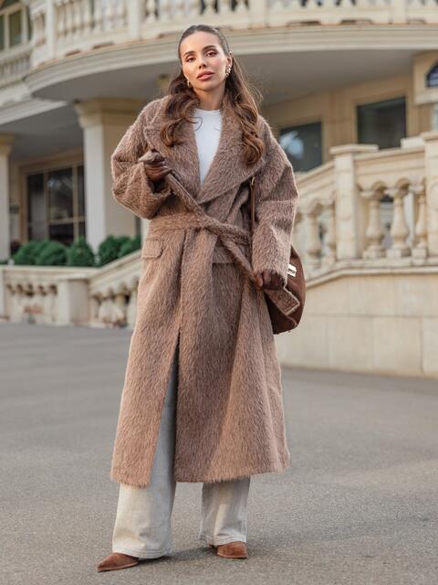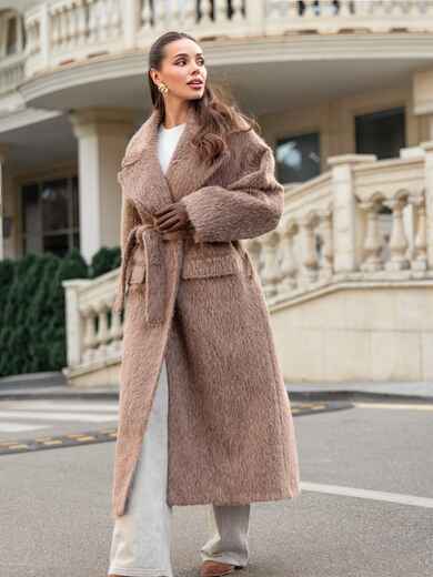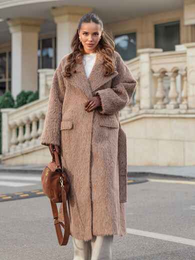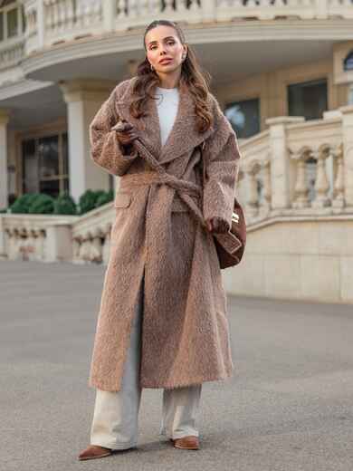 Розкішне пальто з м'якого ворсистого матеріалу, що нагадує альпаку. Завдяки високому вмісту вовни (78%), тканина має довгий, приємний на дотик ворс, що надає пальто об'єм і візуальну м'якість. Виріб на запах, що дозволяє регулювати посадку по фігурі за допомогою широкого пояса з основного матеріалу. Доповнено підкладкою, що підвищує його теплоізоляцію. Також воно має дві бічні кишені-клапани і невеликий розріз ззаду, що робить його зручним для ходьби. Розраховане на температурний режим від +5°C до -5°C.