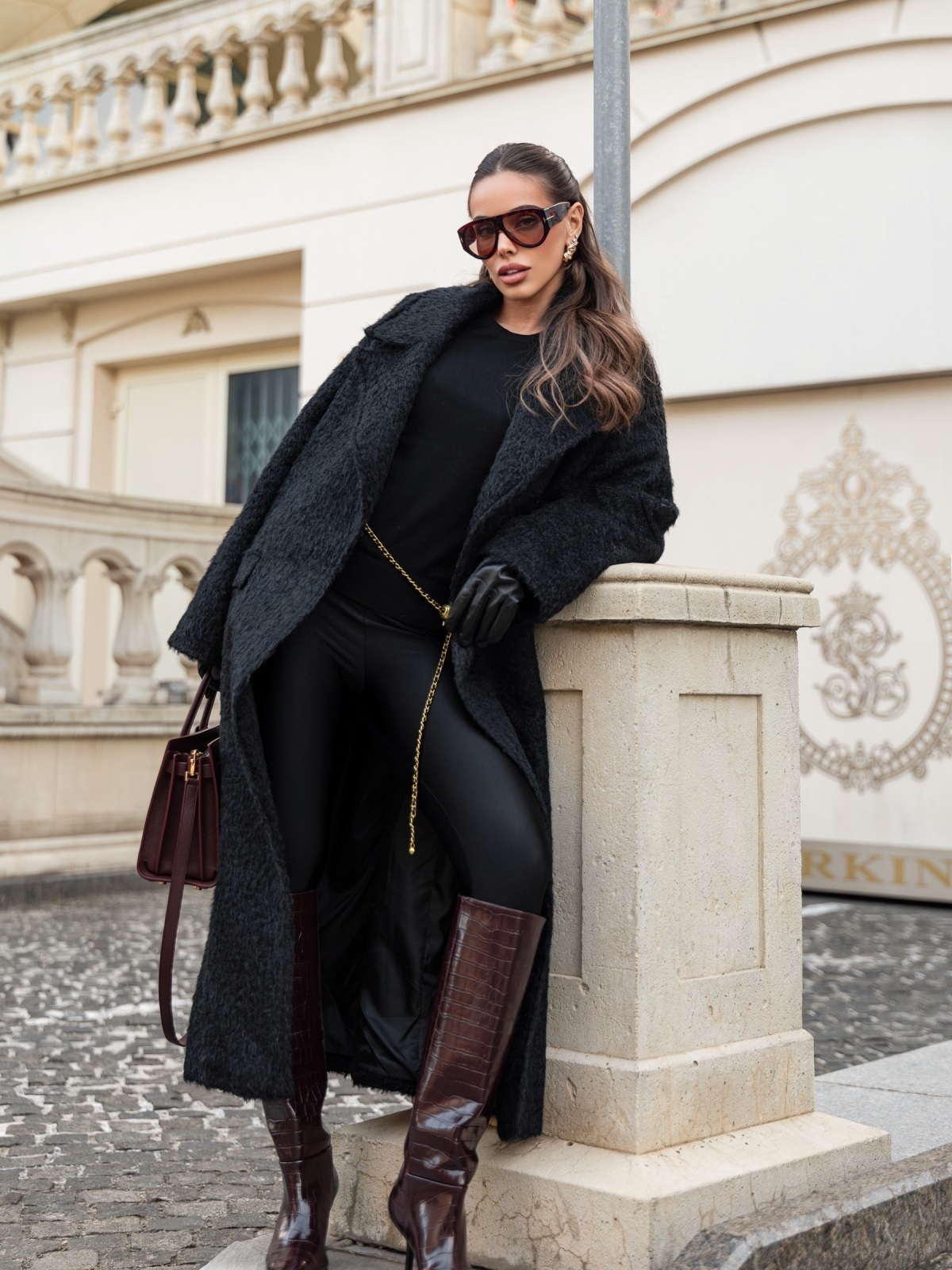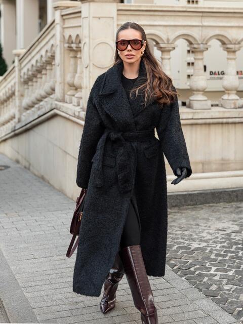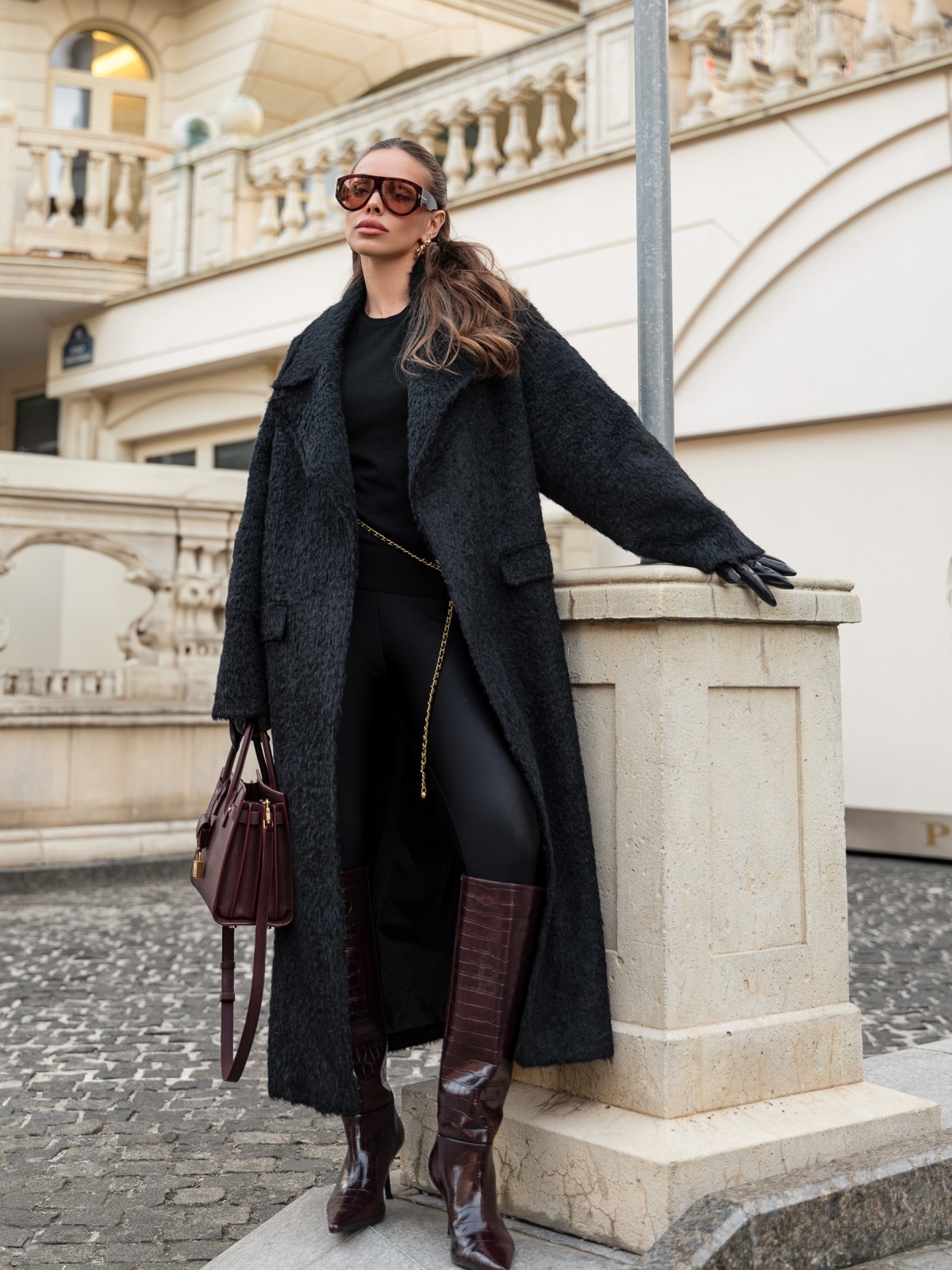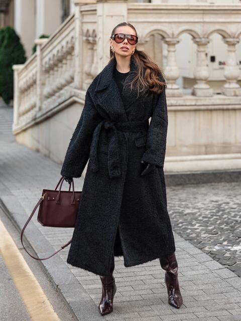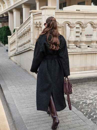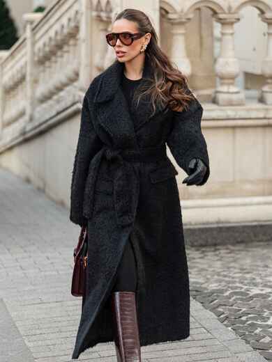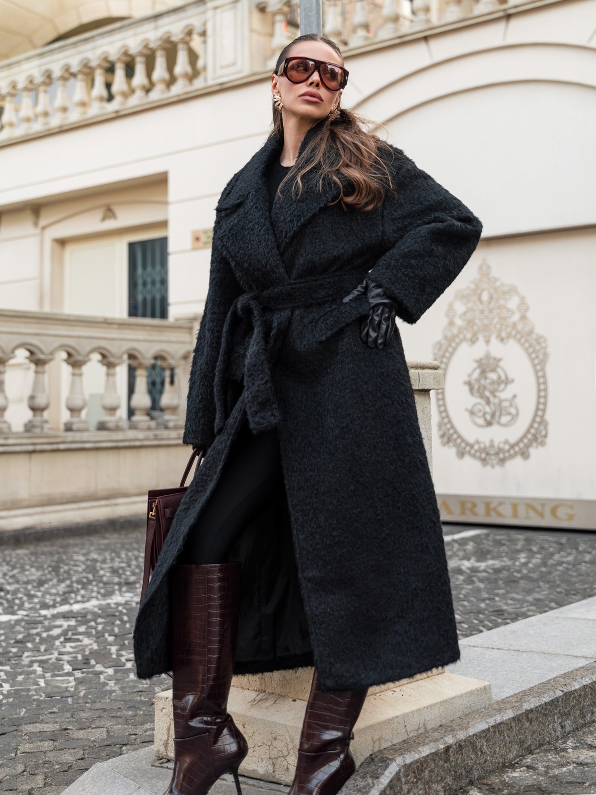 Розкішне пальто з м'якого ворсистого матеріалу, що нагадує альпаку. Завдяки високому вмісту вовни (78%), тканина має довгий, приємний на дотик ворс, що надає пальто об'єм і візуальну м'якість. Виріб на запах, що дозволяє регулювати посадку по фігурі за допомогою широкого пояса з основного матеріалу. Доповнено підкладкою, що підвищує його теплоізоляцію. Також воно має дві бічні кишені-клапани і невеликий розріз ззаду, що робить його зручним для ходьби. Розраховане на температурний режим від +5°C до -5°C.