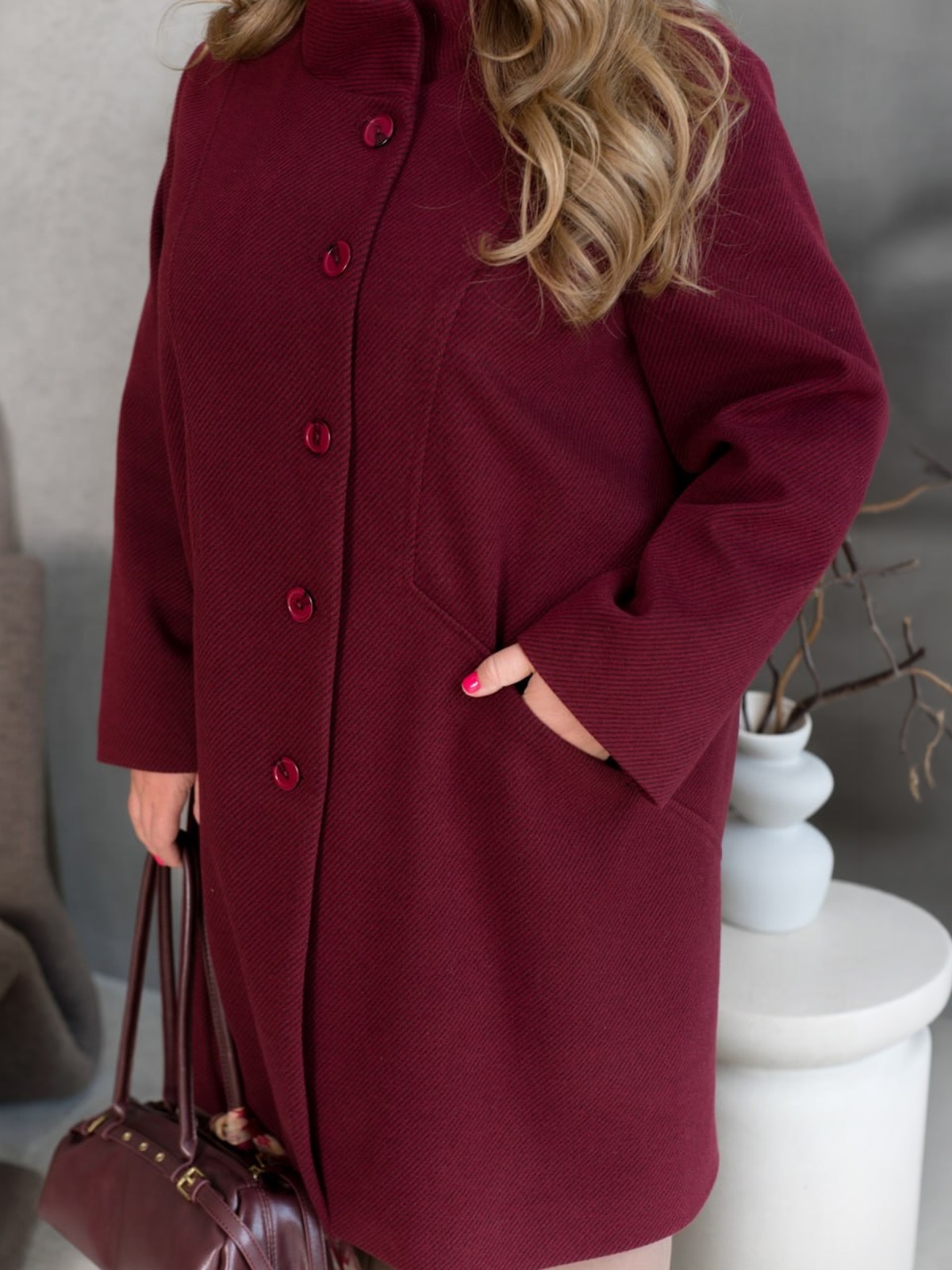 Демісезонне пальто з кашеміру твід у діагональ. Модель вільного крою з коміром-стійкою. Силует підкреслений декоративним швом. Доповнено прорізними кишенями. Застібається на ґудзики.