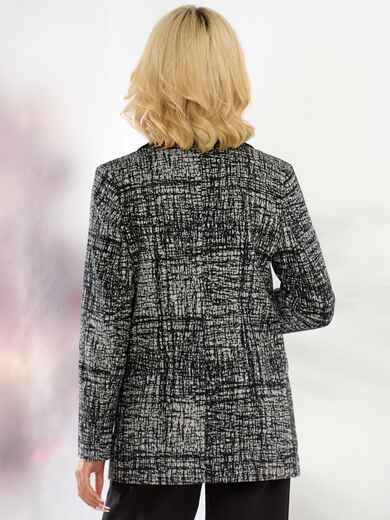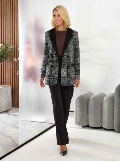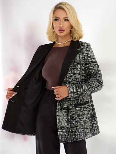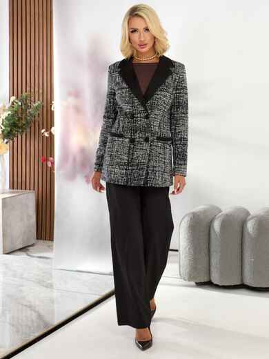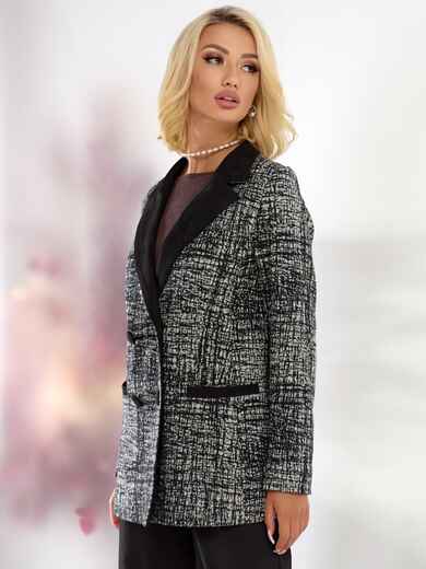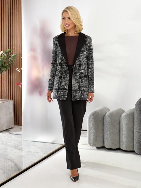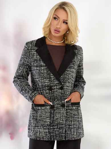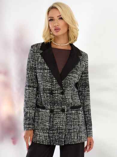 Двобортний піджак з жакарду. Модель з відкладним коміром із замші-діагональ. Прорізні кишені з листочками також оброблені замшею-діагональ. Підкладка забезпечує комфортне одягання, кращу посадку і захист основної тканини, продовжуючи термін служби виробу. Застібається на ґудзики.