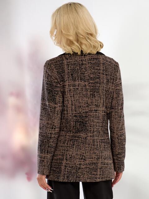 Двобортний піджак з жакарду. Модель з відкладним коміром із замші-діагональ. Прорізні кишені з листочками також оброблені замшею-діагональ. Підкладка забезпечує комфортне одягання, кращу посадку і захист основної тканини, продовжуючи термін служби виробу. Застібається на ґудзики.