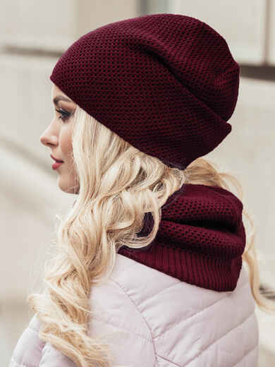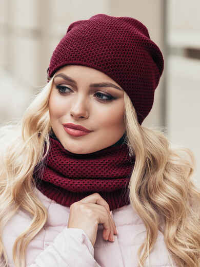 В'язаний комплект складається з двосторонньої шапки і шарфа-снуда, утепленого флисом. В'язка дрібна візерункова.