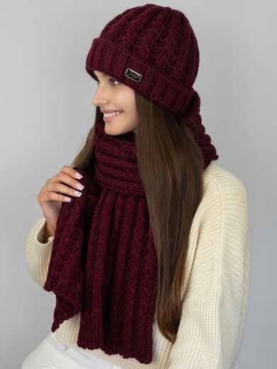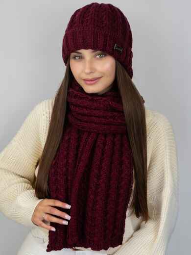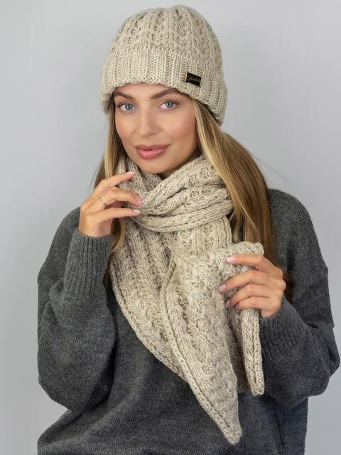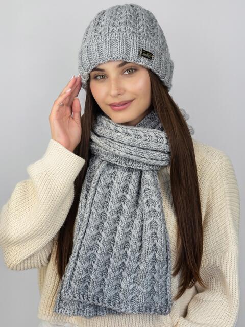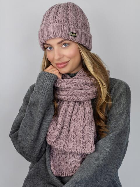 Теплий комплект: шапка і шарф з об'ємним візерунком в'язки. Шапка має класичний крій, що щільно прилягає до голови. Підворот 6 см декорований нашивкою. Всередині мікрофліс Polar. Довгий шарф дозволяє носити його різними способами — вільно накинутим, обгорнутим навколо шиї або зав'язаним у вузол.
