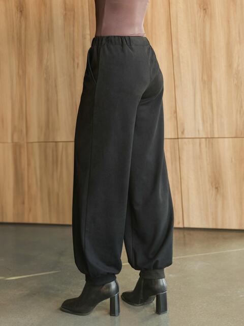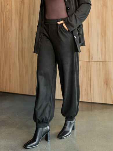 Стильні та зручні штани вільного крою з манжетами. Еластичний пояс на гумці забезпечує комфорт і свободу рухів. Для практичності модель доповнена бічними кишенями.