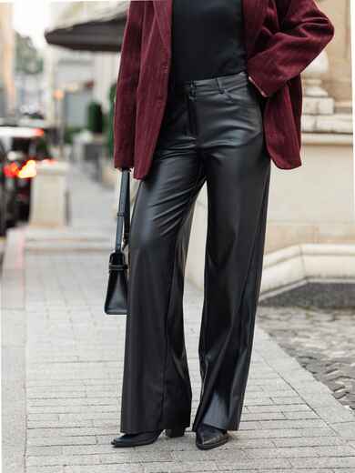 Штани з екошкіри на замші вільного крою. Талія доповнена шлевками для ременя. Застібка на блискавку і ґудзик забезпечує надійну фіксацію. Бічні кишені роблять модель зручною в носінні та функціональною.