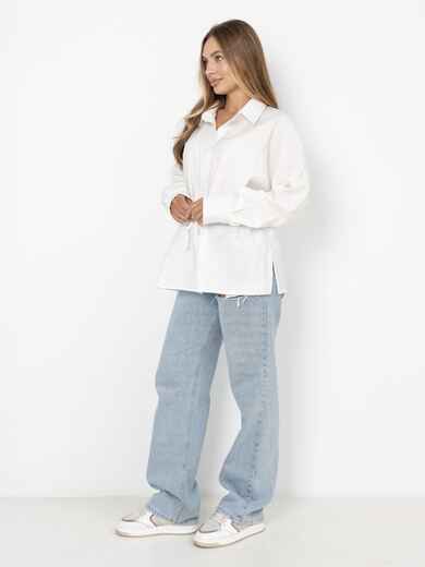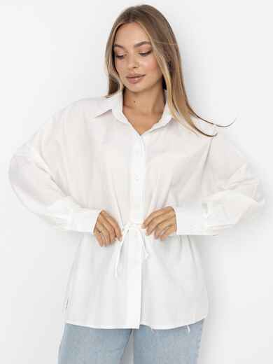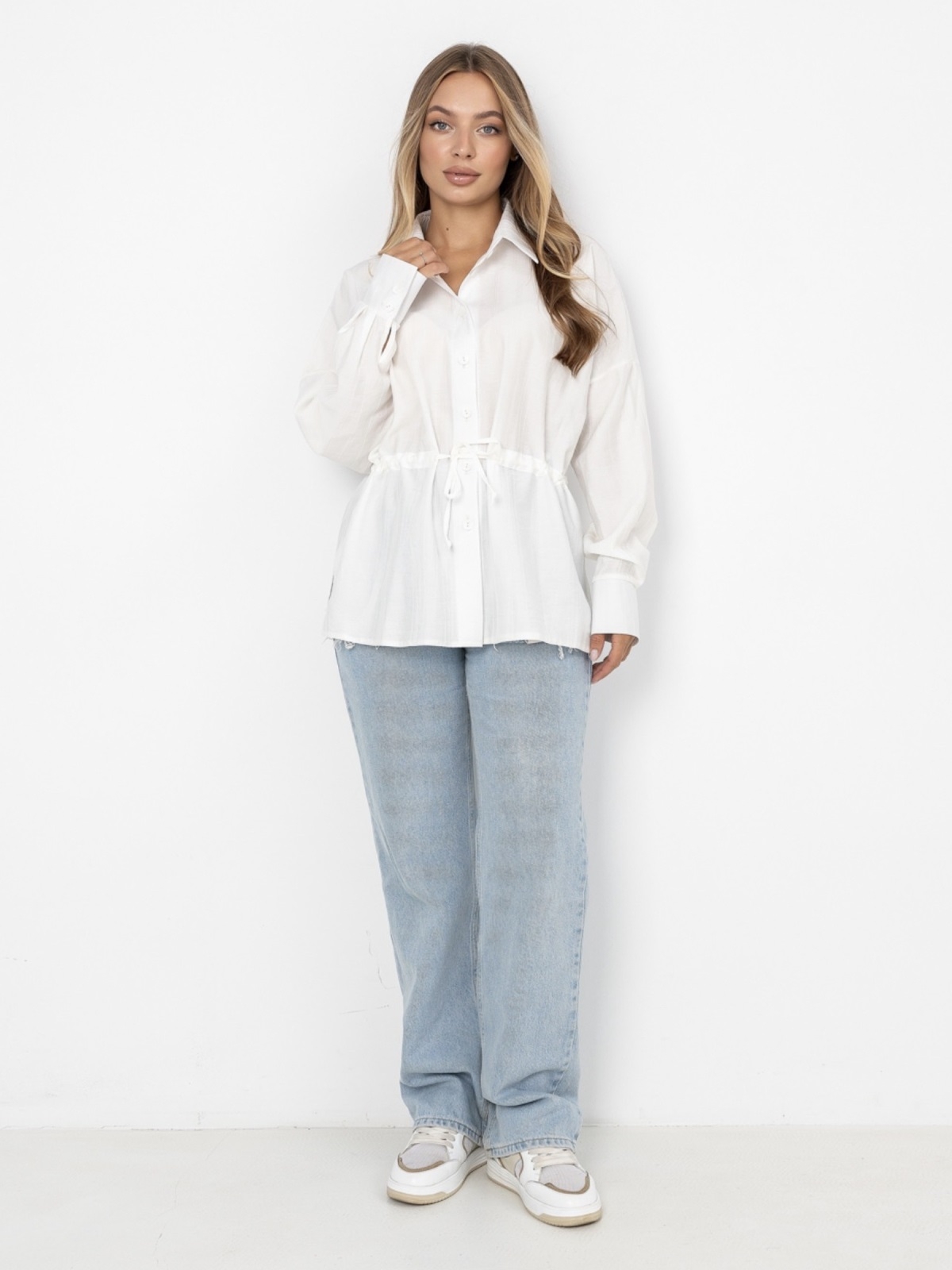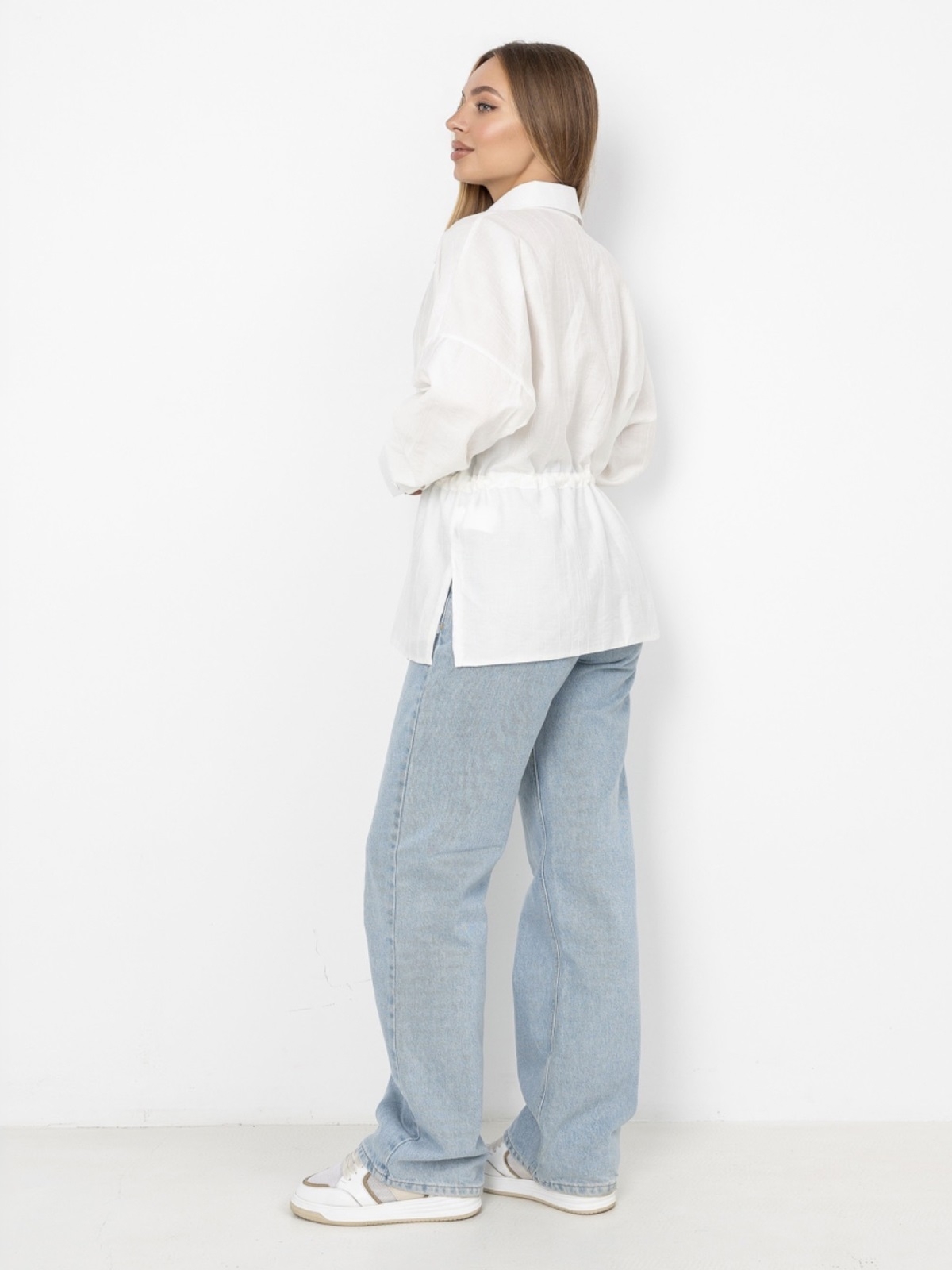 Вільна сорочка з льону-жатки. Куліска на талії дозволяє трансформувати блузку з вільної в приталену з баскою. Низ із бічними розрізами. Сорочка застібається на ґудзики.