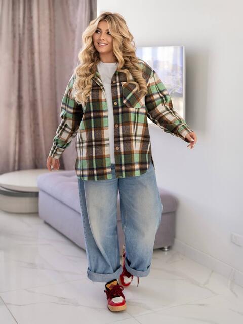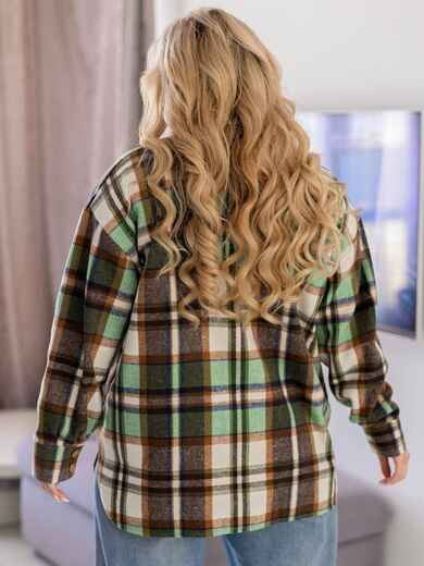 Подовжена сорочка у клітинку. Довгі рукави зі спущеною лінією плечового шва. Поличка доповнена кишенями із клапанами. Застібається на ґудзики.