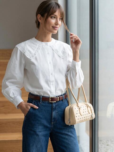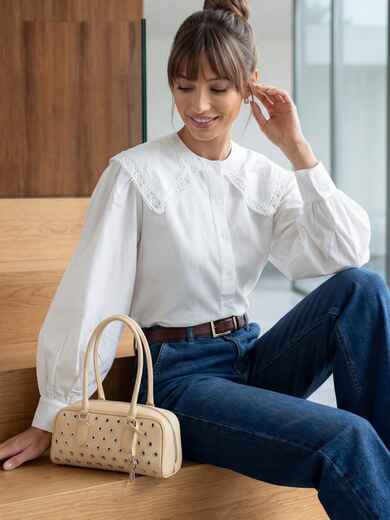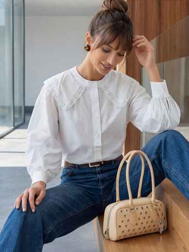 Сорочка з акцентним коміром, який декоровано мереживом. Об’ємні рукави з манжетами застібаються на ґудзик. Виріб застібається на ряд ґудзиків.
