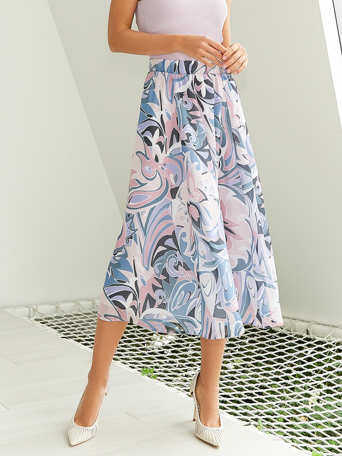 Шифонова спідниця-міді з принтом. Широка резинка вздовж талії. Виріб має бавовняну підкладку.