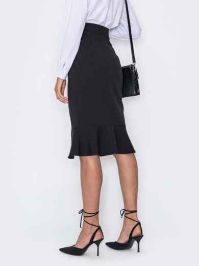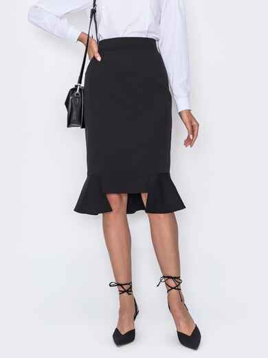 Чорна спідниця-олівець з асиметричним воланом знизу. На спинці прихована застібка-блискавка. Модель підкреслює плавний вигин стегон і стрункість талії.