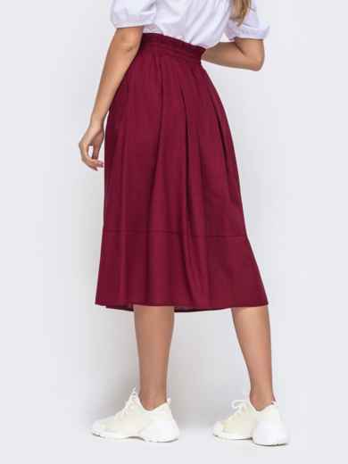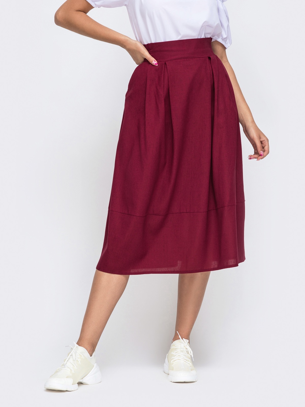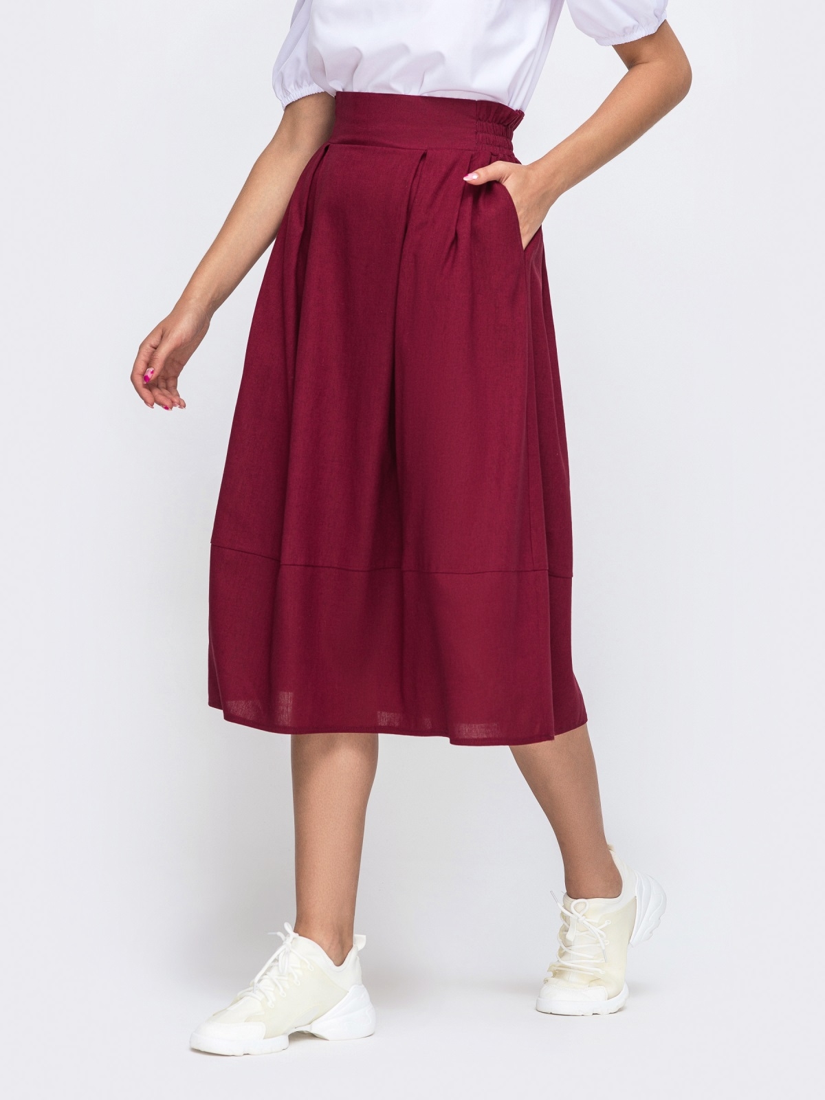 Спідниця-балон довжини міді зі складками з дихаючої лляної тканини. Знизу модель доповнена широкою вставкою. В бічних швах передбачені кишені. Ззаду пояс призібраний на резинку.