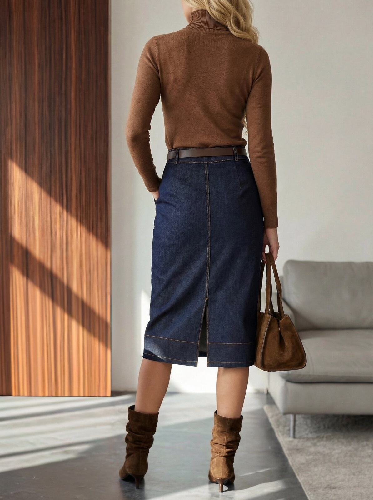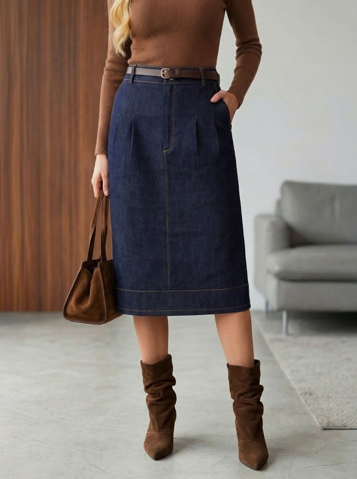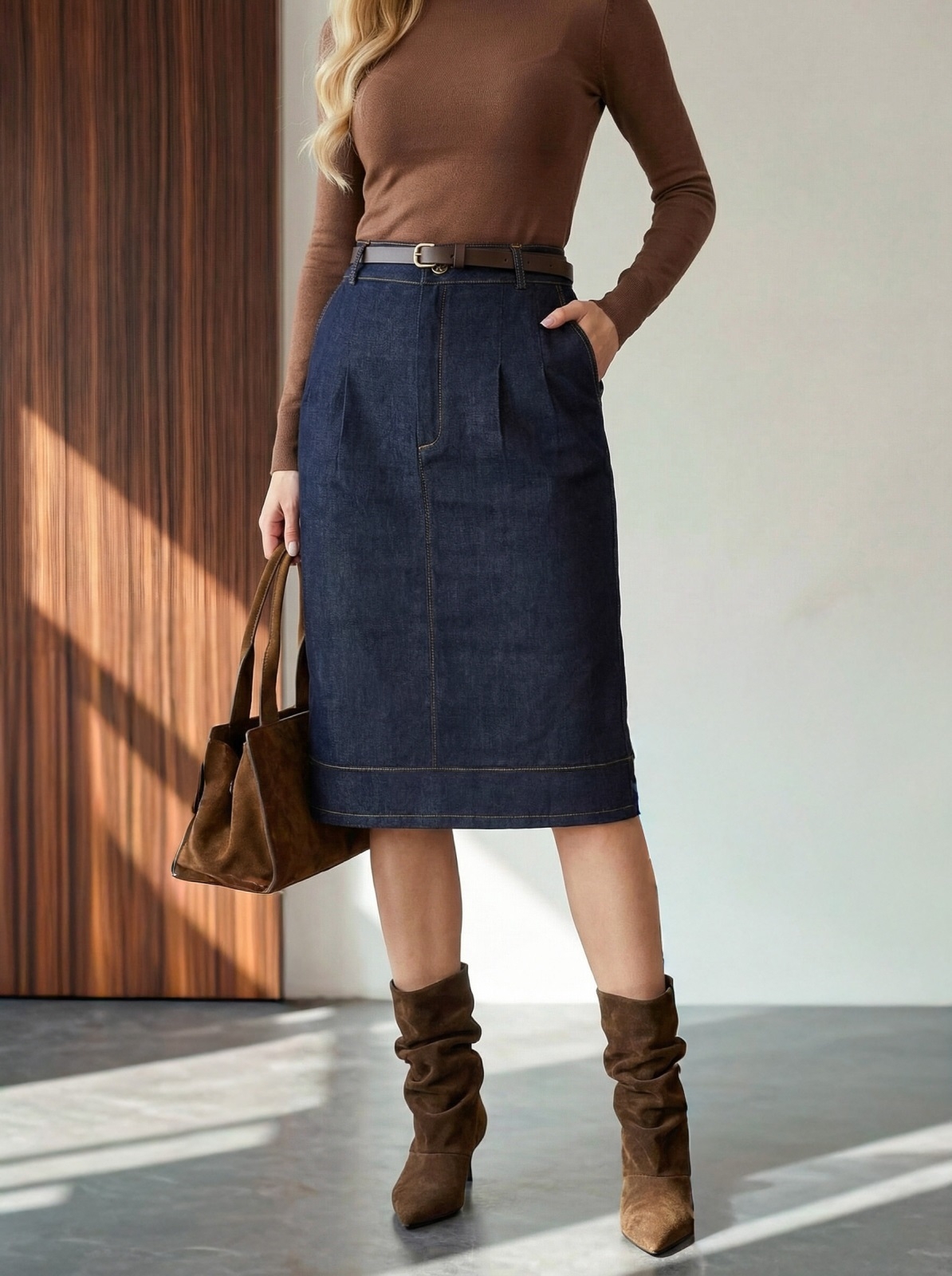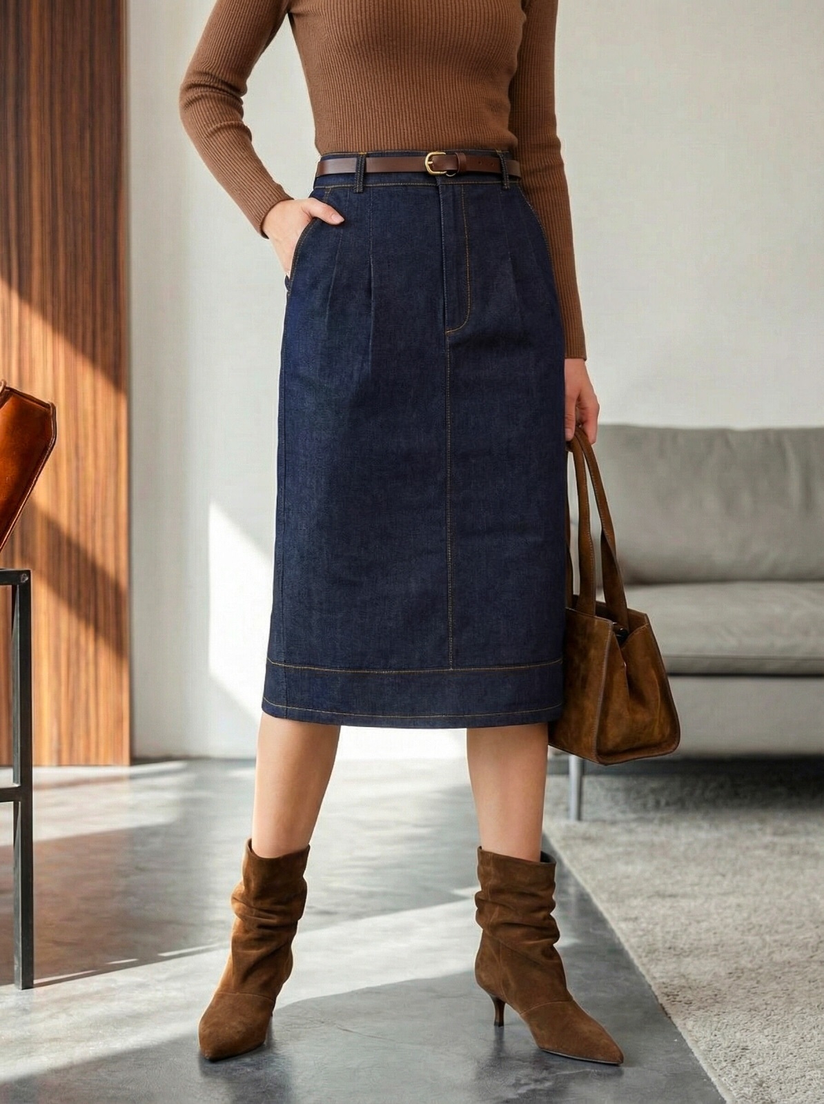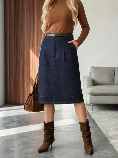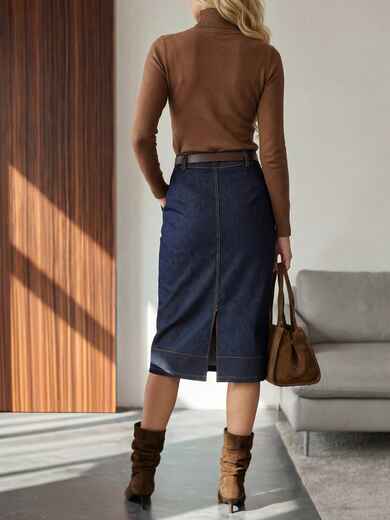 Пряма спідниця з деніму. Модель із зашипами спереду та кишенями. Ззаду розріз. Застібається на блискавку та ґудзик. Виріб декорований контрастною оздоблювальною строчкою. Комплектується поясом.