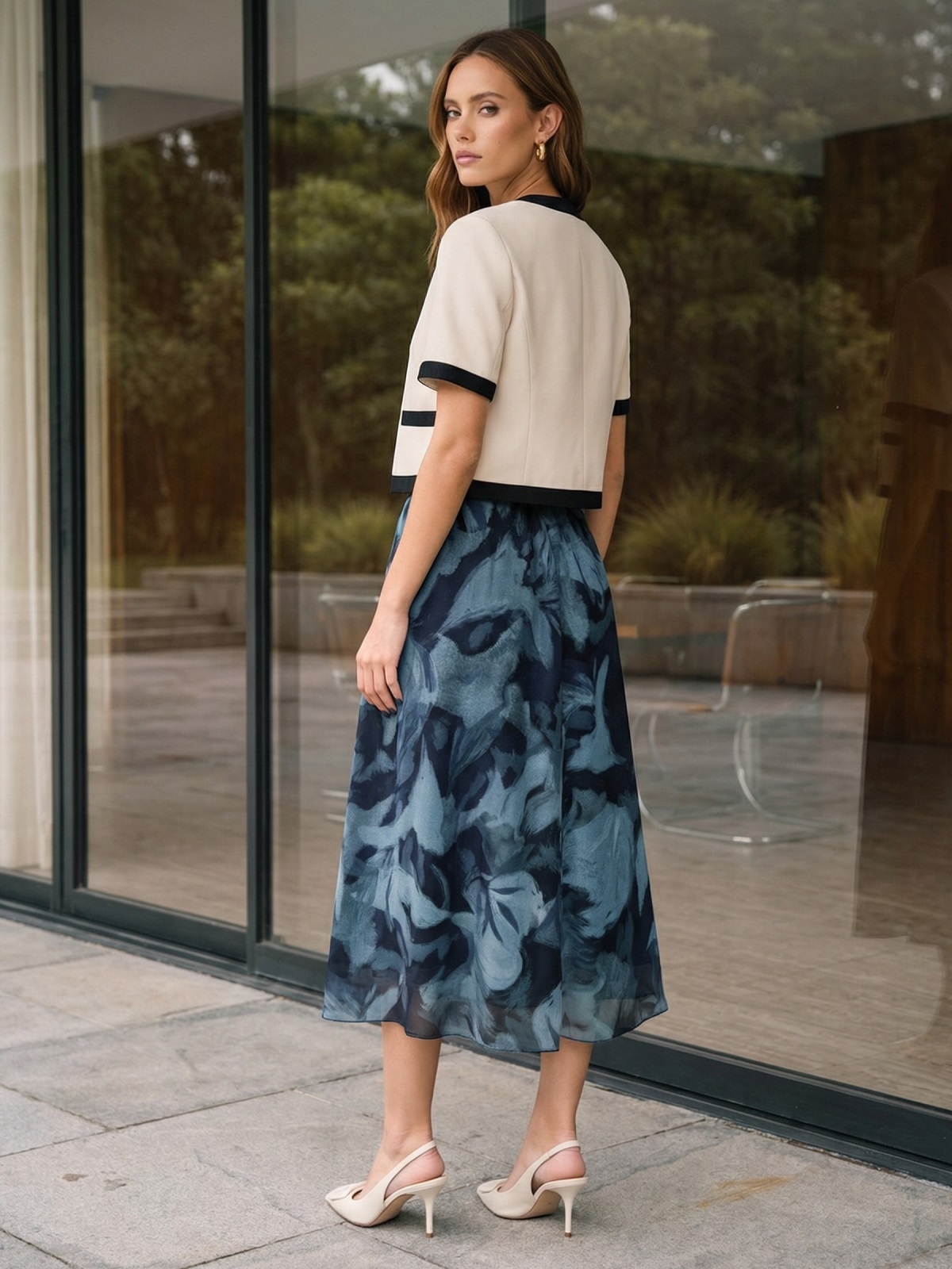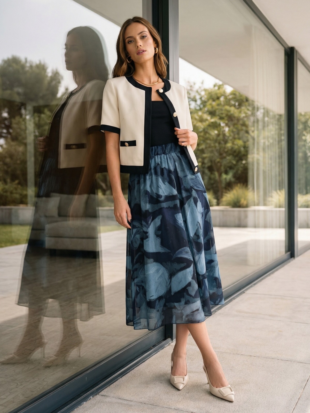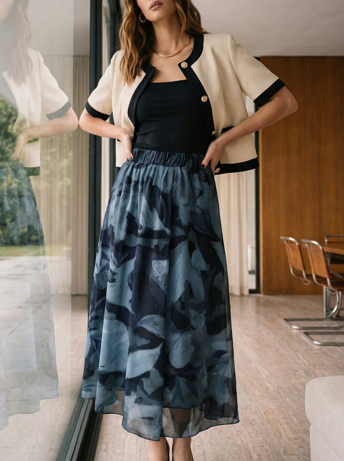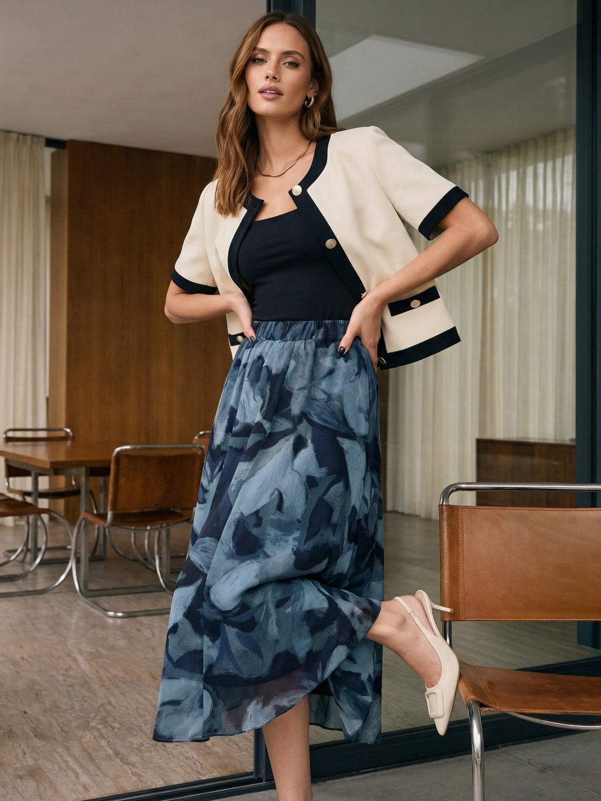 Добре поєднується з базовими топами, сорочками або блузами, а також із взуттям на підборах або на плоскій підошві.