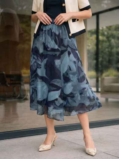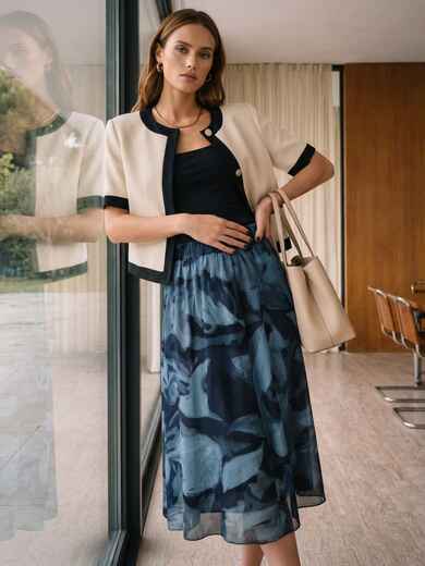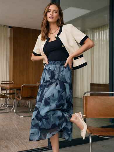 Спідниця міді з бавовни на підкладці та абстрактним принтом виглядає повітряно та сучасно. Кольорове рішення дозволяє легко поєднувати спідницю з базовими речами.