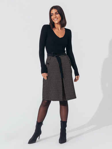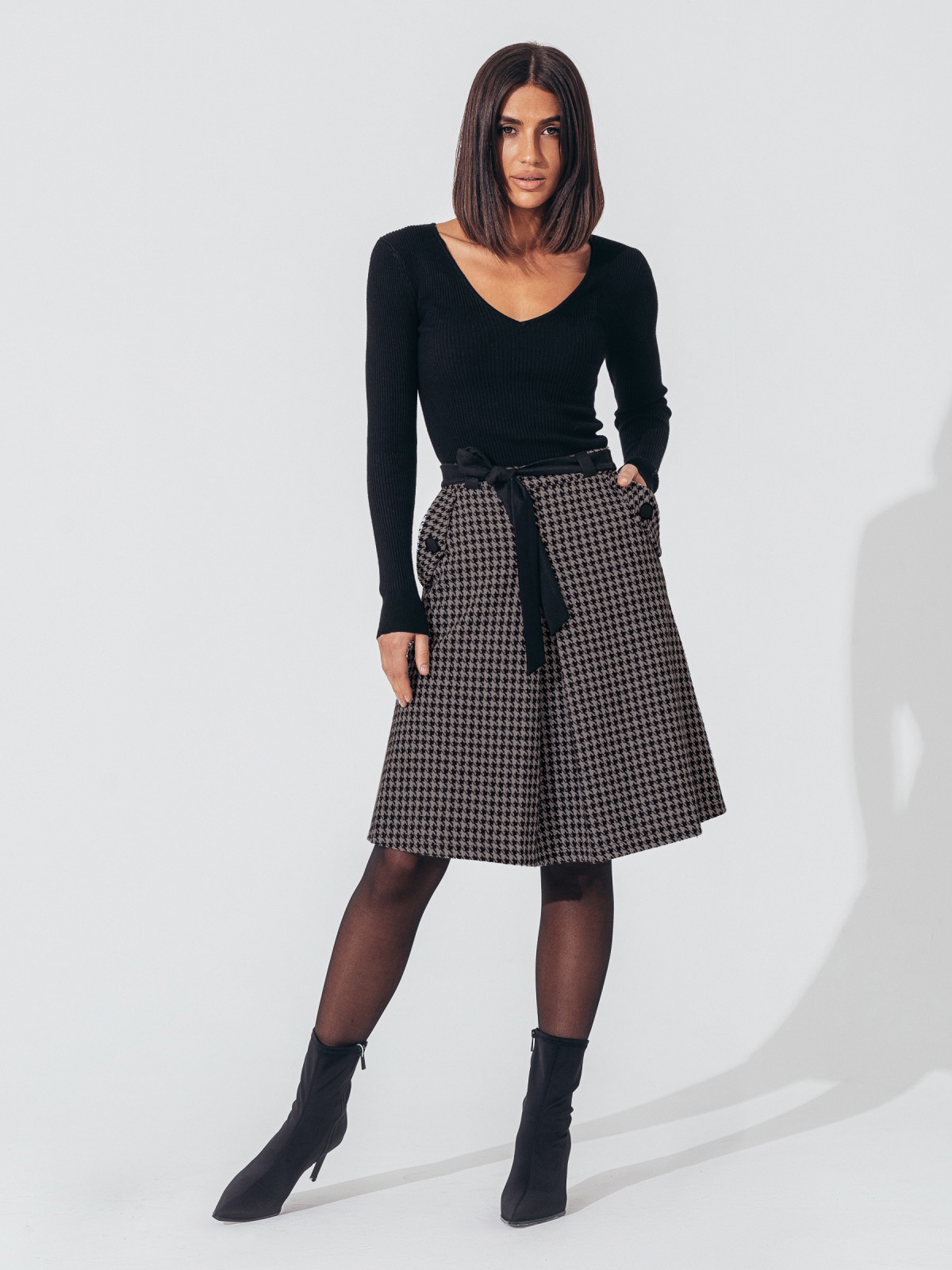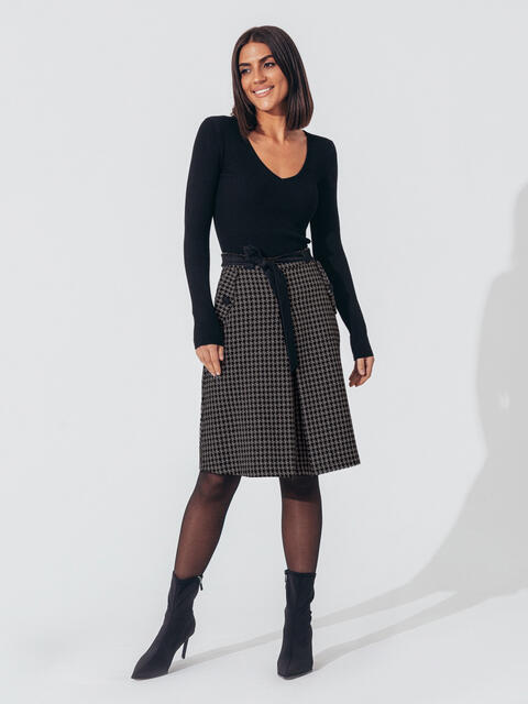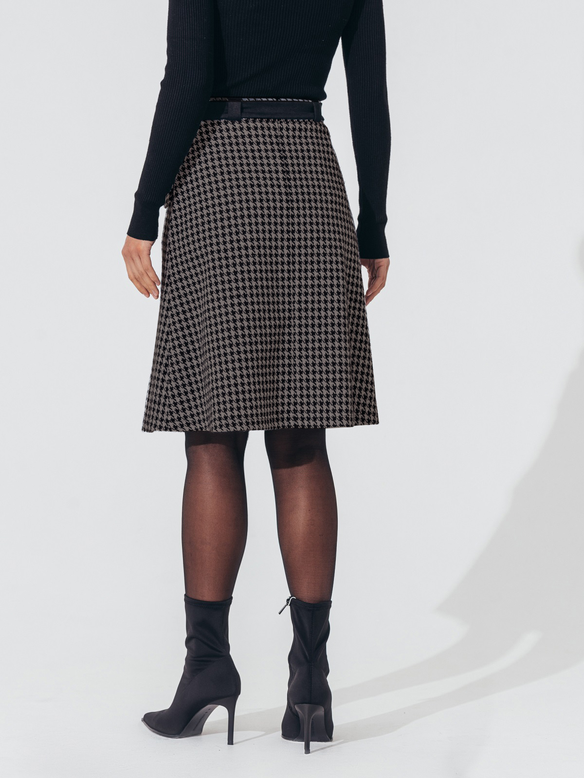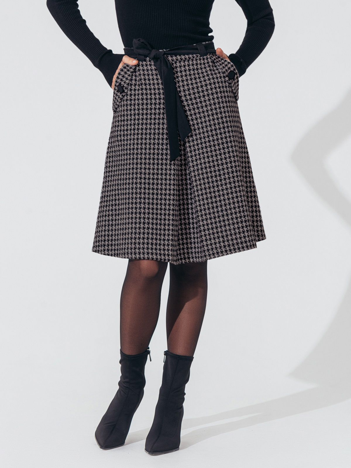 Спідниця-трапеція у гусячу лапку. Шльовки та пояс із замші-діагональ. Втачний пояс збоку доповнений гумкою для комфортної посадки по фігурі. Виріб із зустрічною складкою спереду. Збоку розташовані прорізні кишені з клапанами декорованими ґудзиками. Застібається на приховану блискавку ззаду.