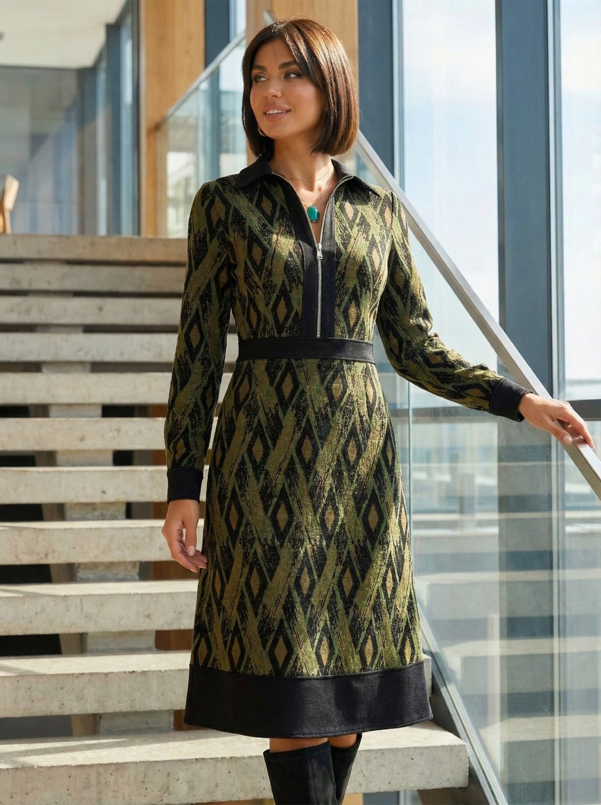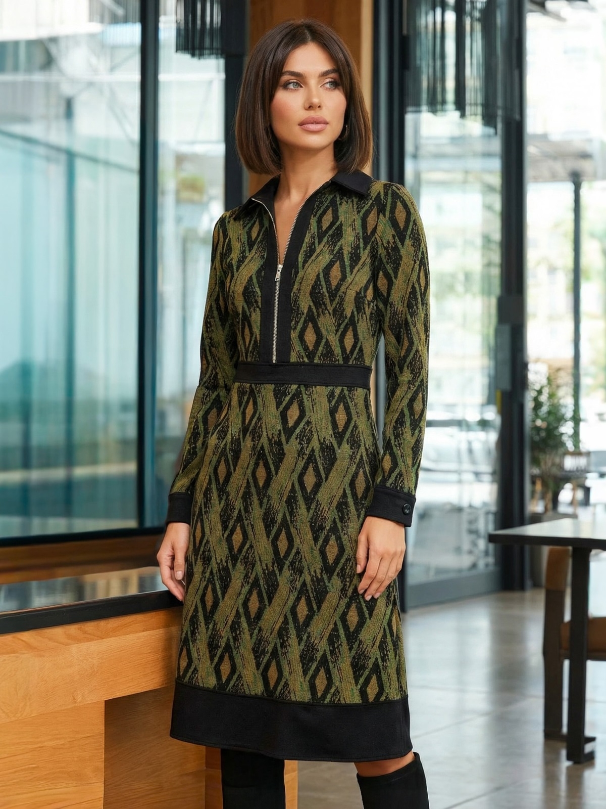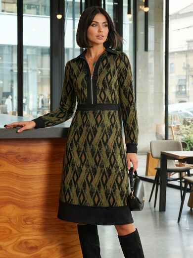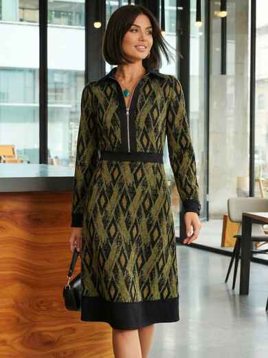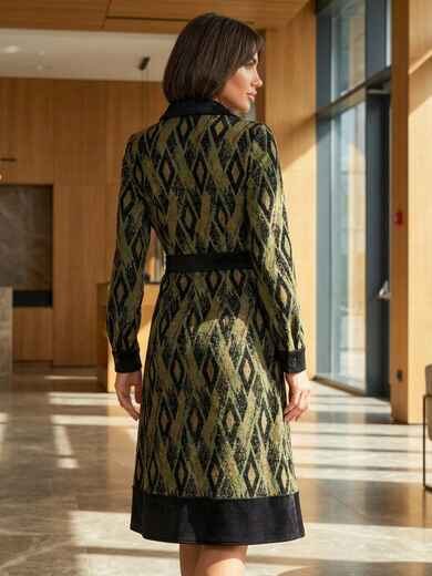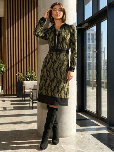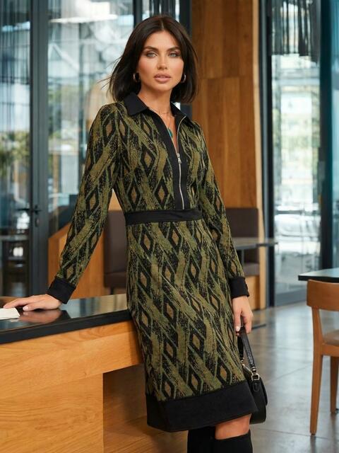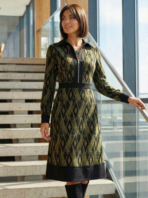 Трикотажне плаття в ексклюзивний принт з класичним коміром. Модель відрізна вздовж талії зі спідницею-трапецією. Застібається на приховану блискавку збоку.