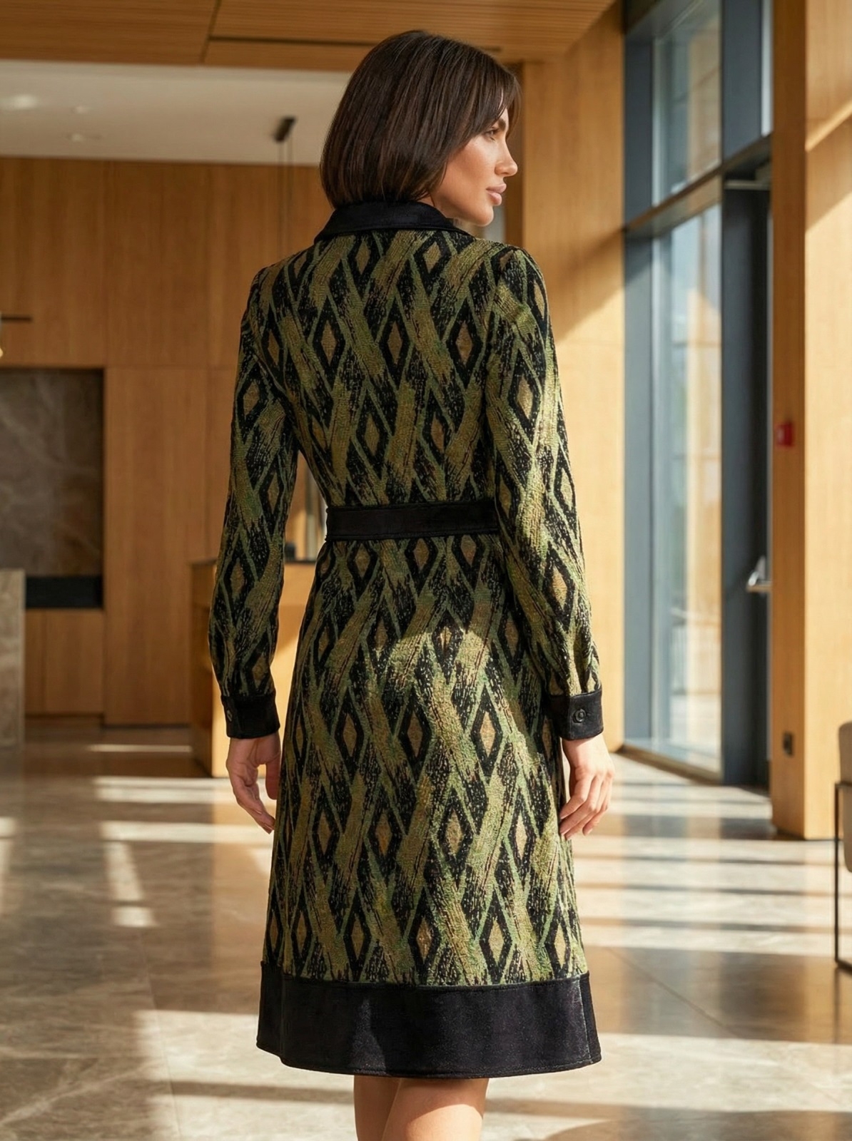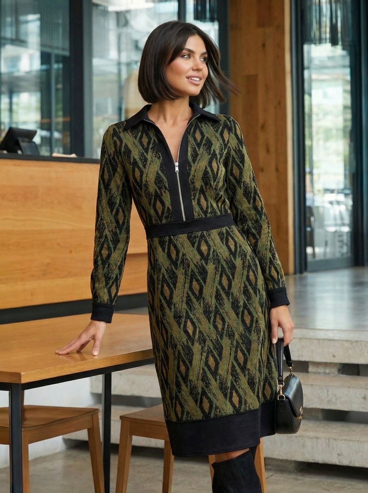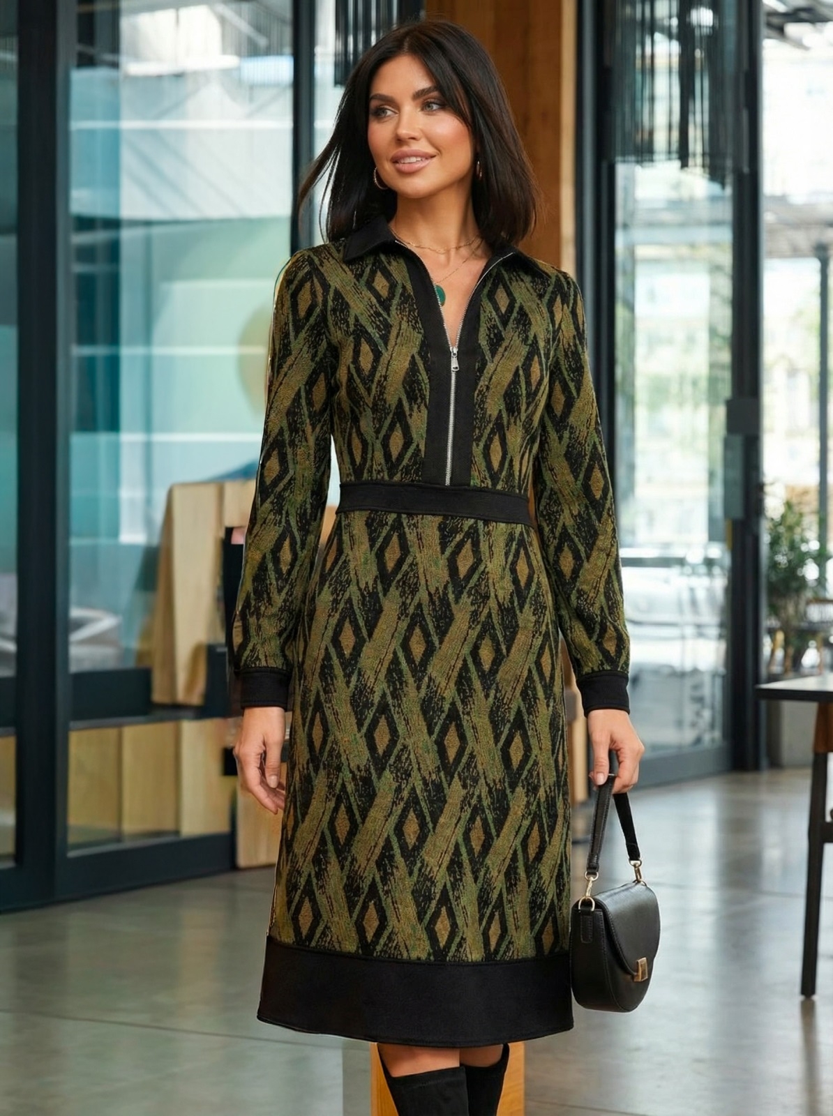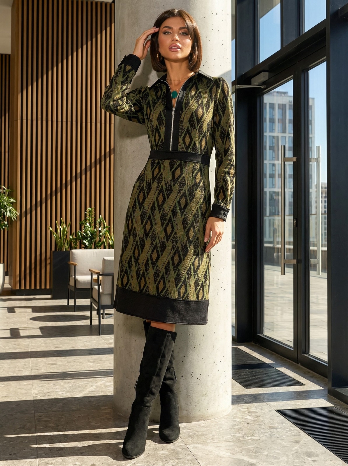 Трикотажне плаття в ексклюзивний принт з класичним коміром. Модель відрізна вздовж талії зі спідницею-трапецією. Застібається на приховану блискавку збоку.