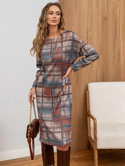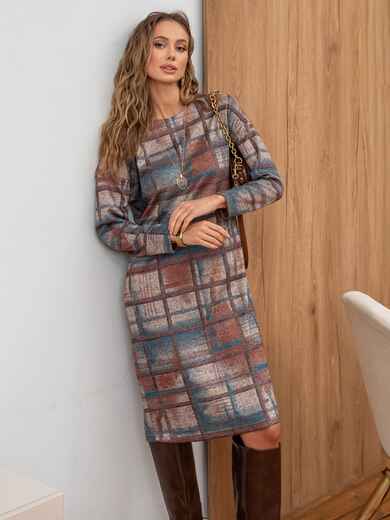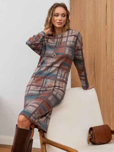 Сукня з полірованої ангори у клітинку. Модель прямого крою зі спущеною лінією плечового шва. Прикраса до комплекту не входить.