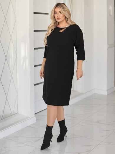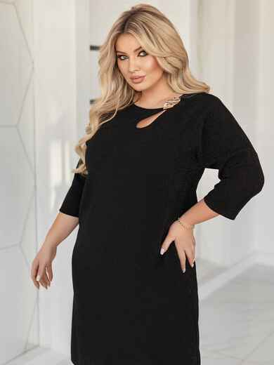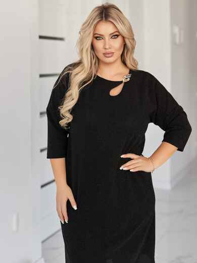 Сукня прямого крою з люрексу. Модель зі спущеним плечем. Горловина з фігурним вирізом і брошкою. Без застібки.