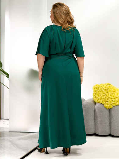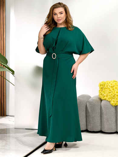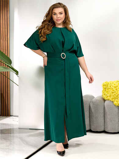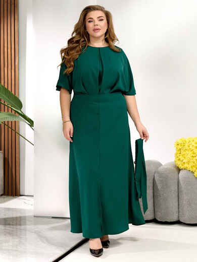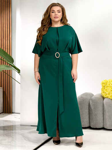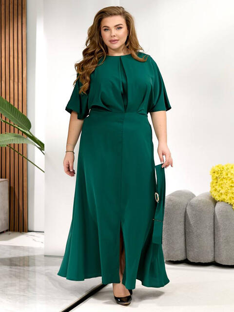 Елегантна сукня максі з костюмної тканини. Модель із круглим вирізом доповнена складками, що створюють лаконічне драпірування в зоні ліфа. Вільні рукави забезпечують зручну посадку та свободу рухів. Лінія талії підкреслена знімним поясом у тон виробу з декоративною круглою пряжкою. Спідниця має розріз спереду. Застібається ззаду на приховану блискавку.