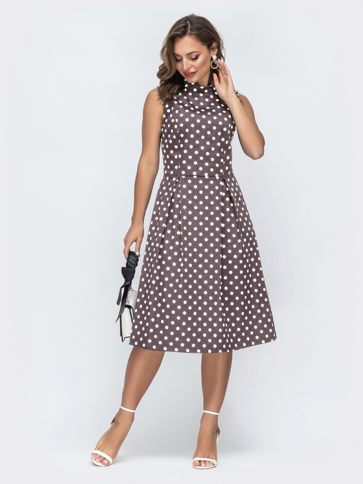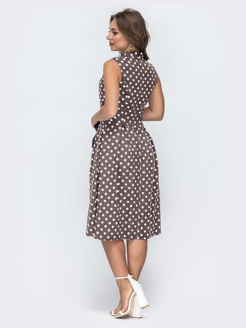 Сукня в горох із приталеним силуетом та бантовими складками виглядає елегантно та підкреслює жіночність образу. Контрастний принт робить модель помітною та стильною.