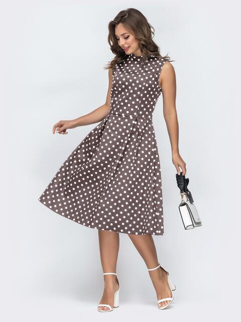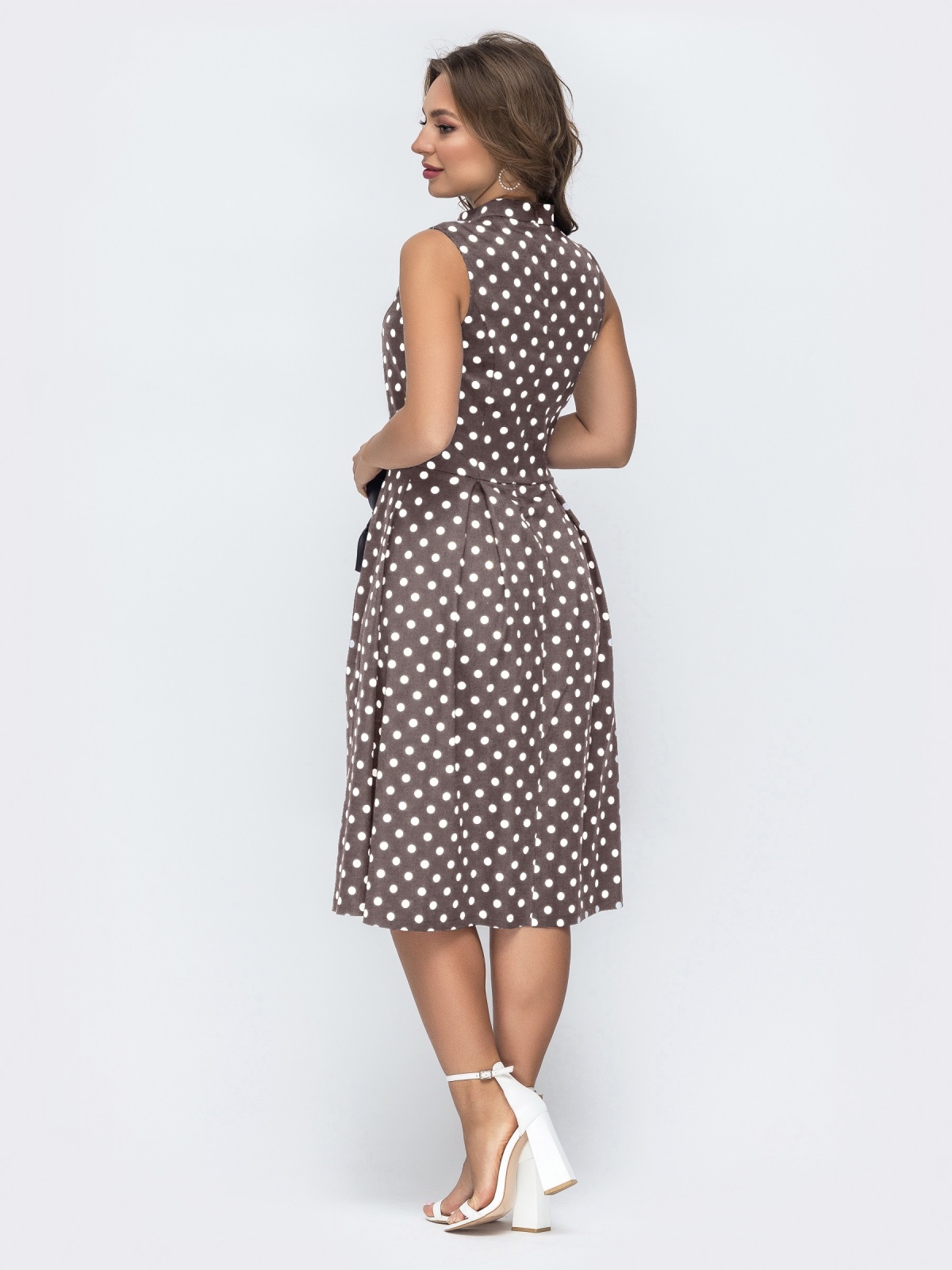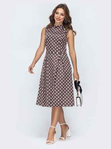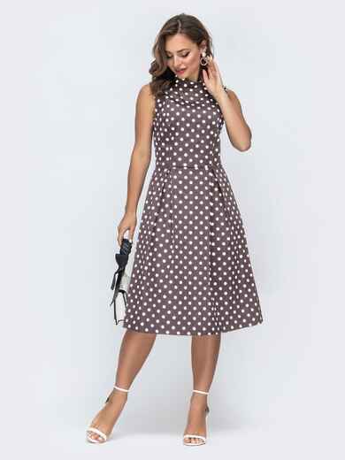 Модель має приталений крій із чіткою лінією талії. Верх виконаний із коміром-стійкою, який підкреслює лаконічність, а відсутність рукавів додає легкості. Спідниця розкльошеного крою формує м’який об’єм і плавний силует. Ззаду передбачена потайна блискавка.
