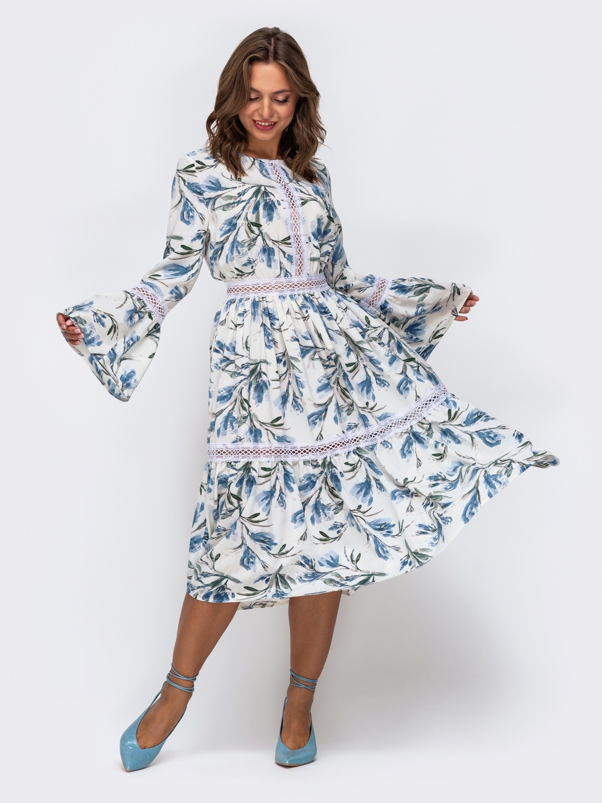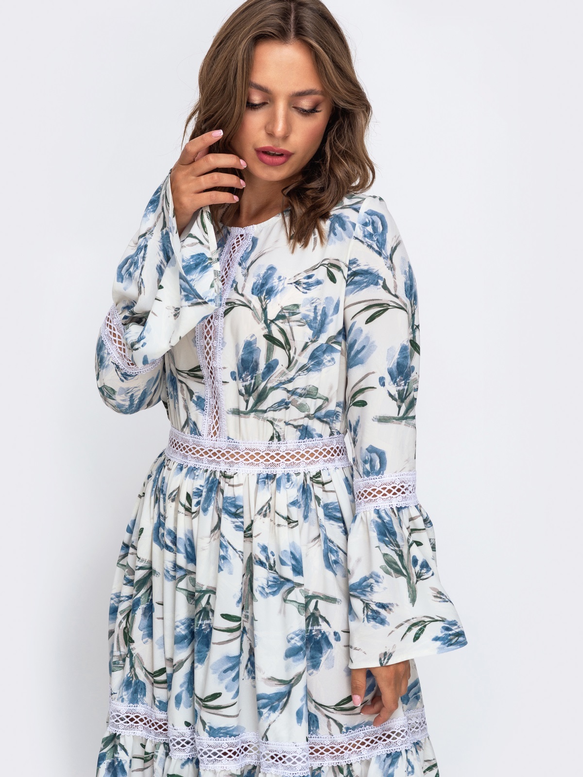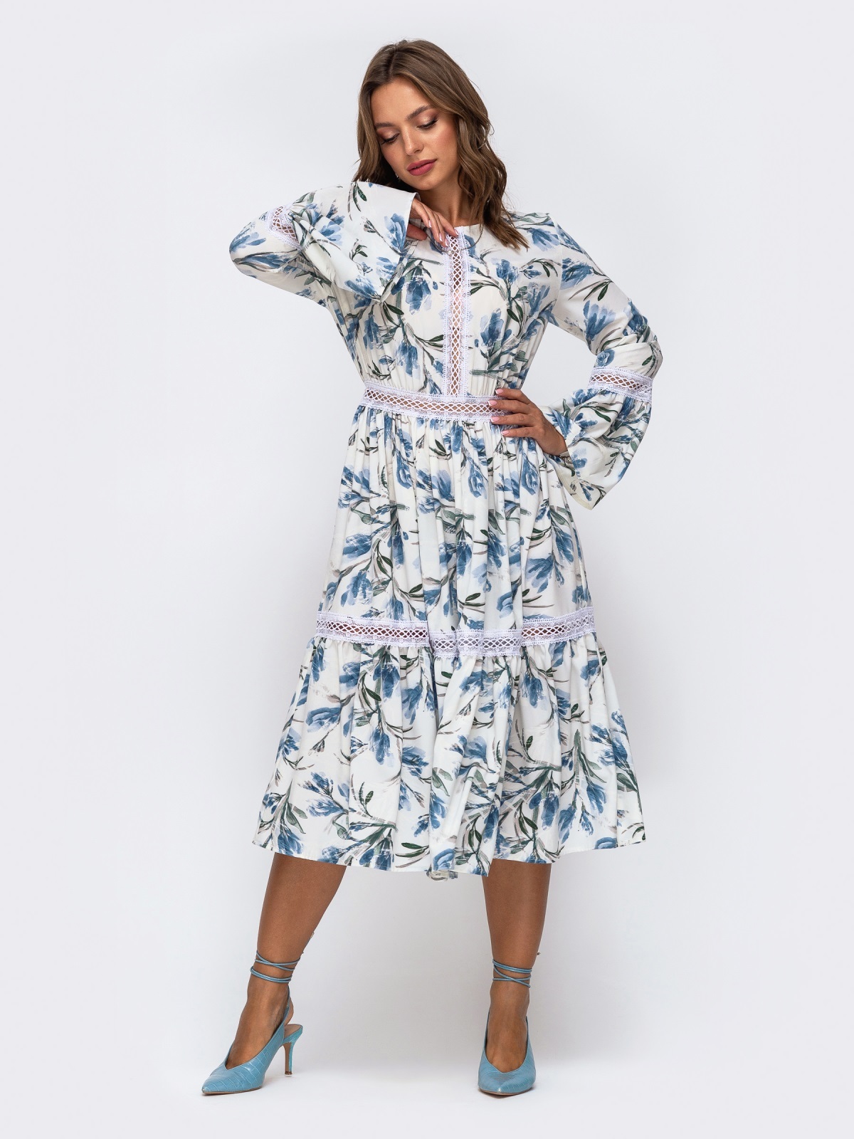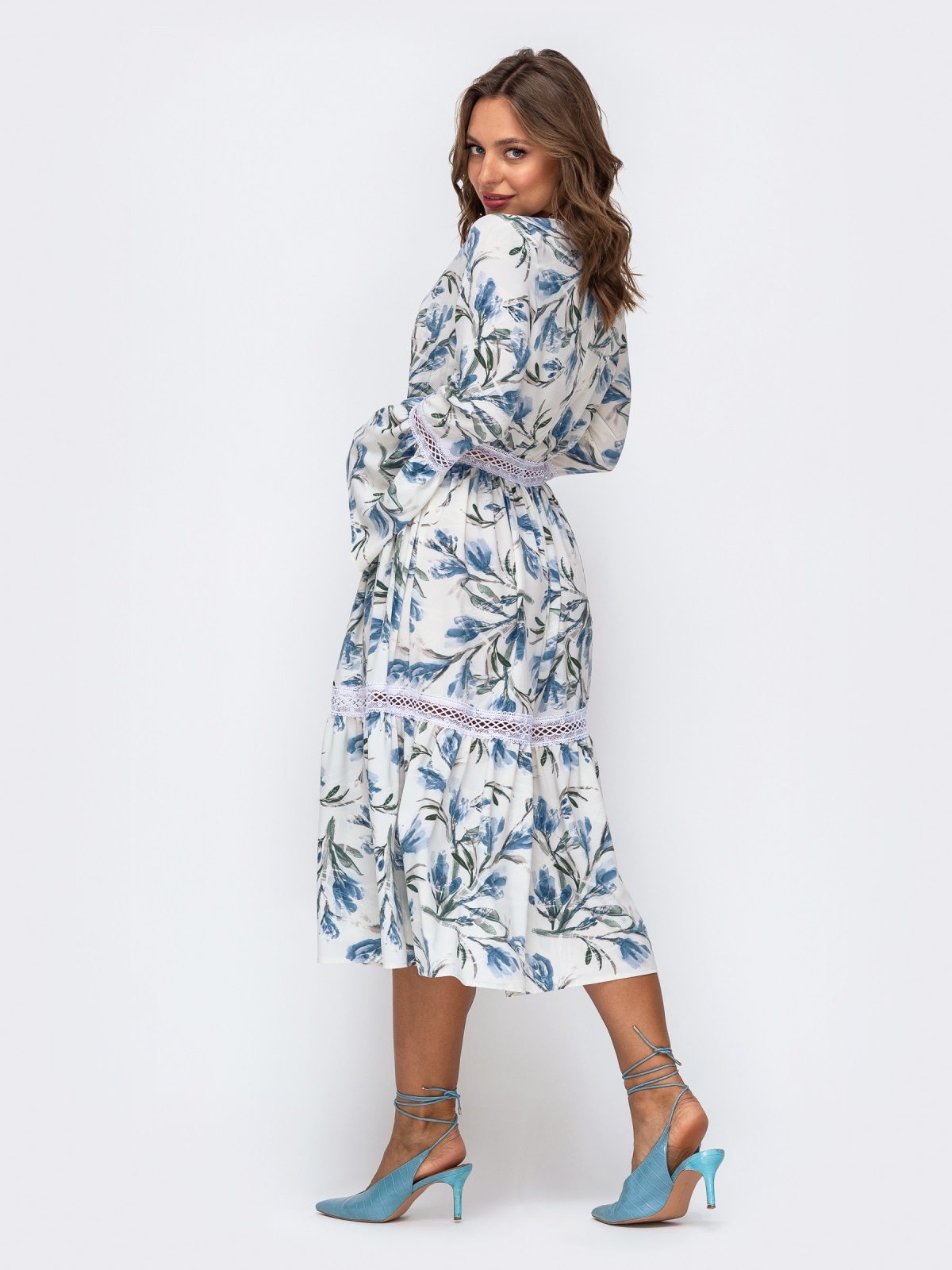 Принтована сукня-міді з мереживними вставками на поличці і спідниці. Довгі рукава з широким воланом на манжеті. Застібається на приховану блискавку на спинці.