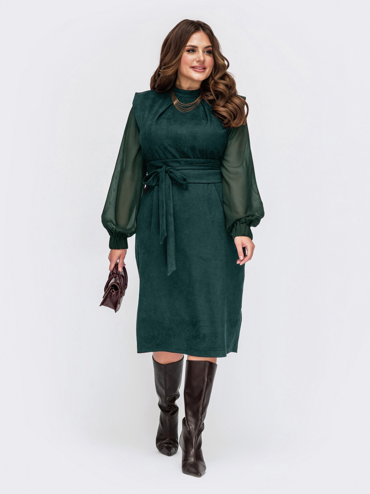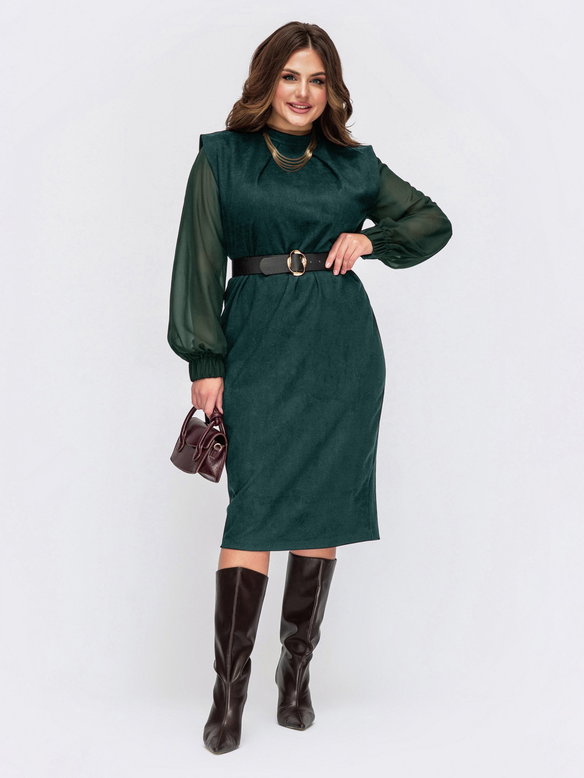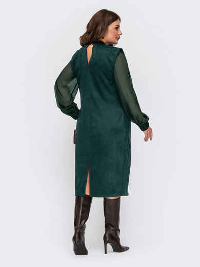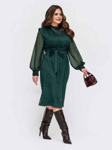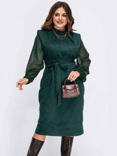 Комбіноване плаття зi складами на горловині та розрізом ззаду. Довгі шифонові рукава з еластичними манжетами. Застібається ззаду на ґудзик. Знімний пояс у комплекті.