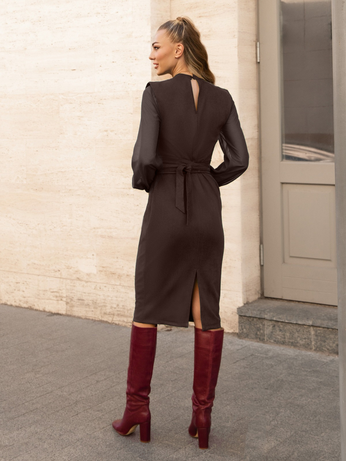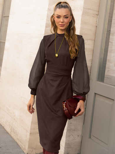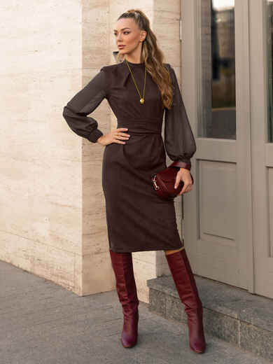 Комбіноване плаття зi складами на горловині та розрізом ззаду. Довгі шифонові рукава з еластичними манжетами. Застібається ззаду на ґудзик. Знімний пояс у комплекті.