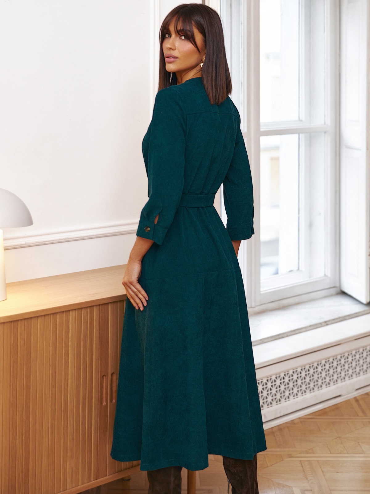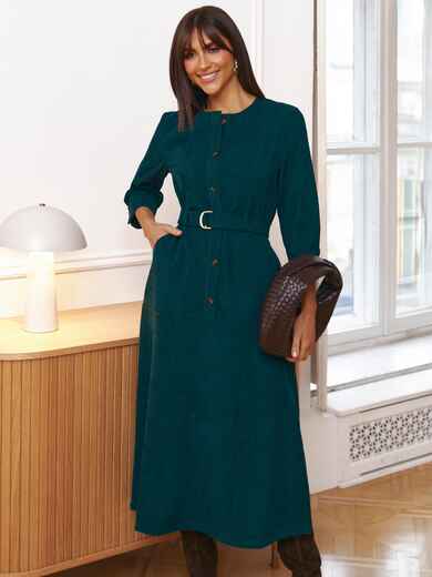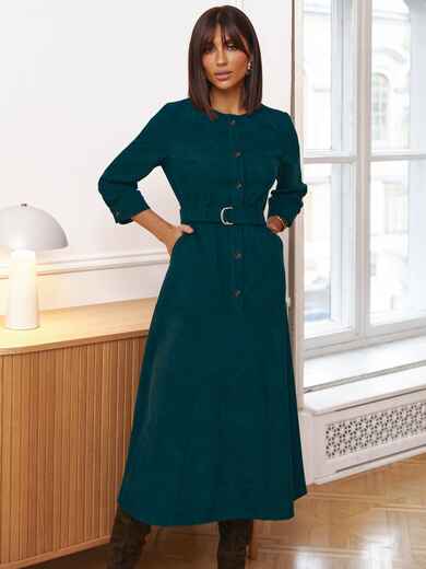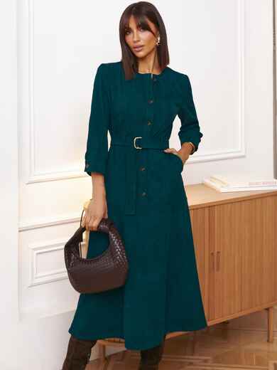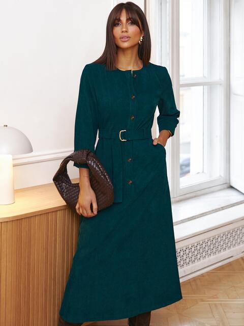 Сукня з мікровельвету. Виріб з круглою горловиною та рукавами ¾. Талія доповнена шльовками. Комплектується поясом із основного матеріалу із пряжкою. Застібається на ґудзики спереду.