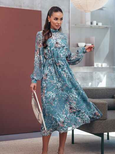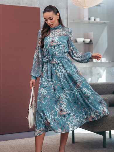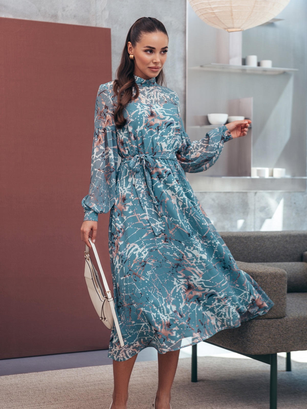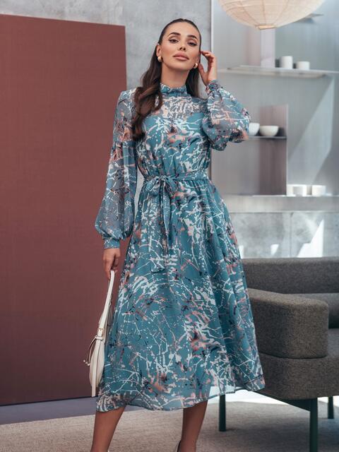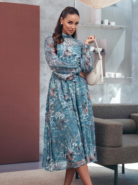 Сукня міді з принтом – елегантне рішення для повсякденних та вечірніх образів. Модель виконана з повітряного шифону з попліновою підкладкою – не просвічує та комфортна у носінні. Комір-стійка та довгі рукави з манжетами на ґудзику. Відрізна по талії. Пояс у комплекті підкреслює фігуру. Застібається на ґудзик ззаду.