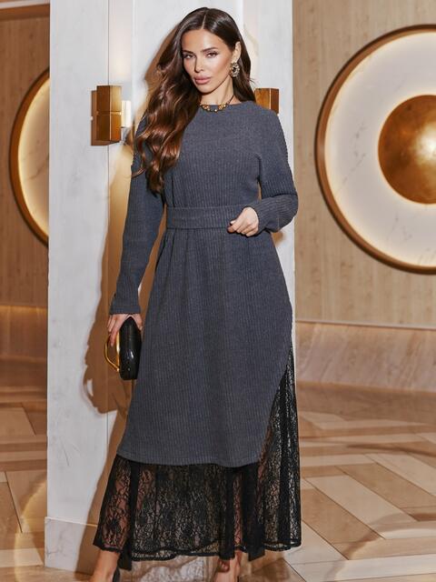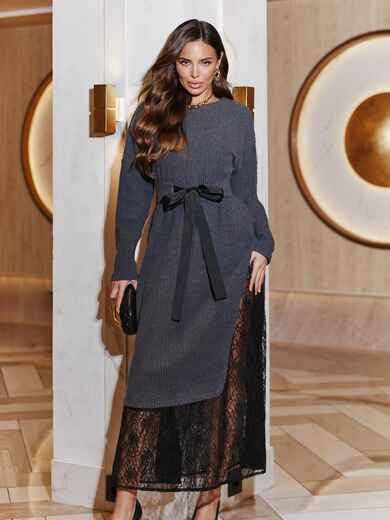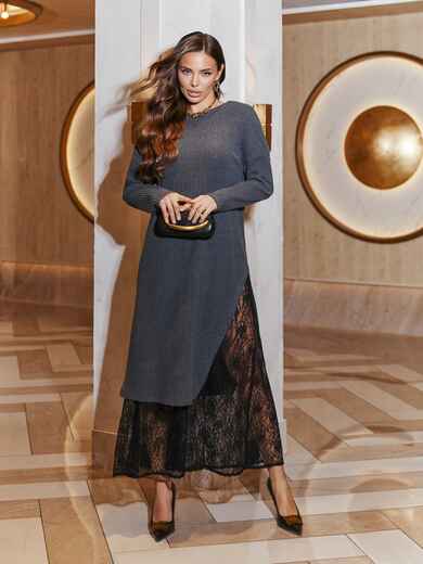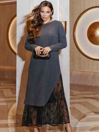 Сукня з теплого трикотажу зі спідницею з гіпюру. А - силует, зі спущеною лінією плеча, з вирізом на боці. Без застібок. Спідниця з еластичною деталлю на талії. Пояс в комплекті, який можна зав'язати по-різному, залежно від настрою та ситуації.
