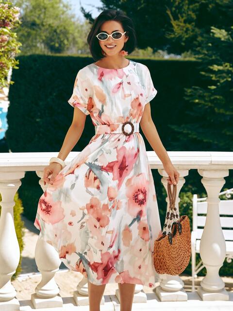 Повсякденна сукня із високоякісного турецького матеріалу з принтом. Модель відрізна вздовж талії з еластичною деталлю по талії. Для зручності в бічних швах передбачені кишені. Широкий пояс з основної тканини з масивною пряжкою в комплекті.