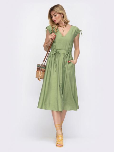 Розкльошені плаття з софту з V-вирізом. Талія відрізна з вафельною збіркою на куліску, що переходить в кокетливі зав'язки. З боків розташовані кишені, спереду розріз.