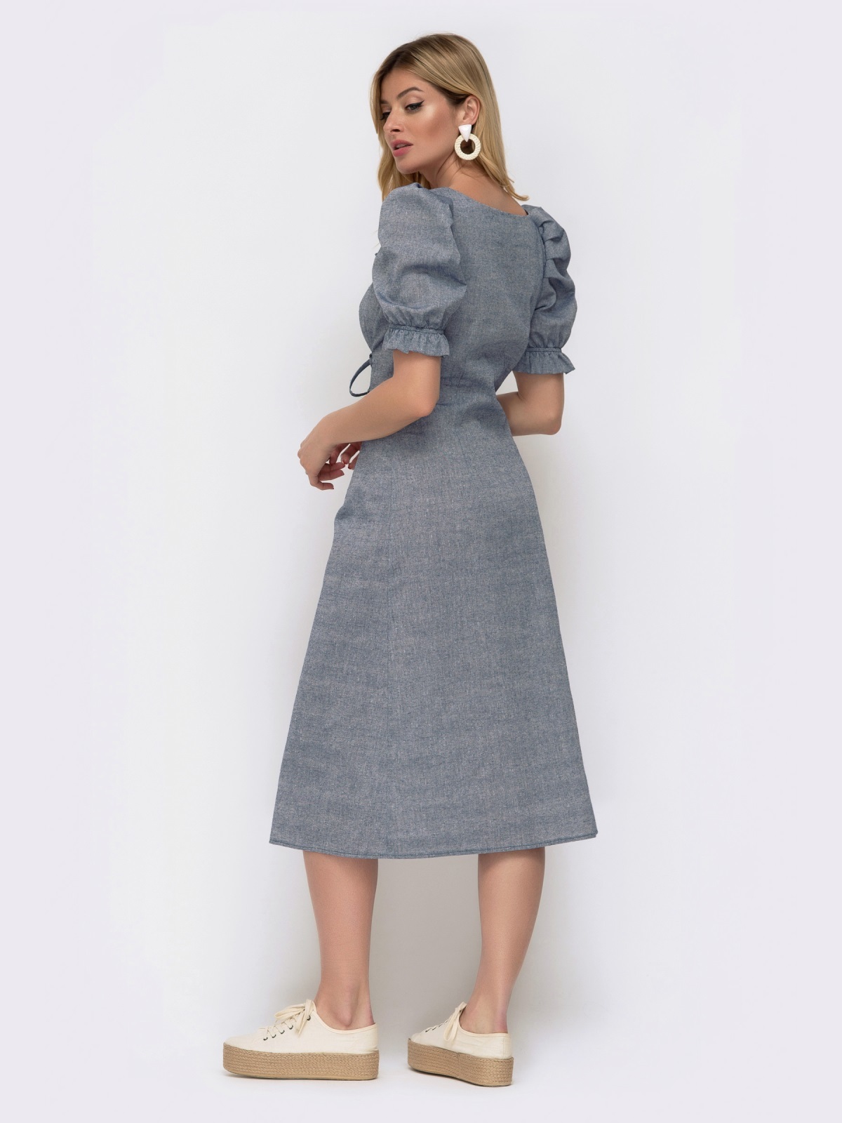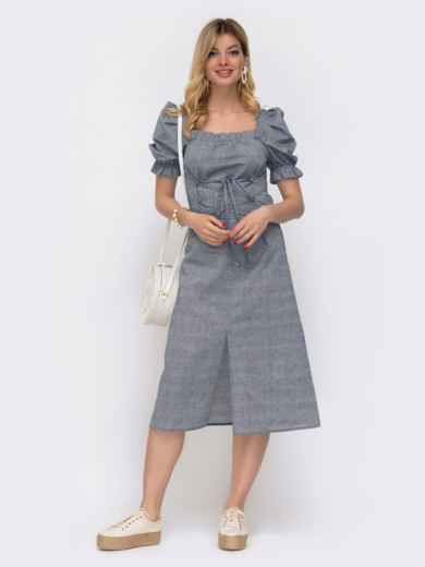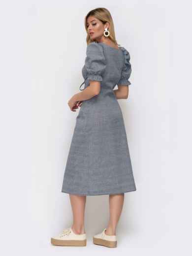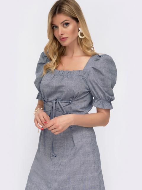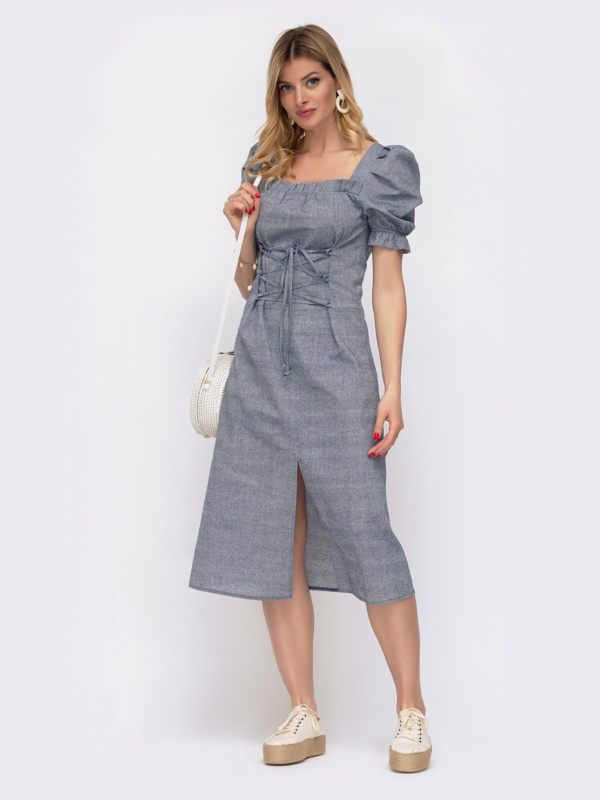 Лляне плаття з короткими рукавами-ліхтариками і високим розрізом спереду. Виріз каре призібраний на еластичну тасьму з рюшею. Шнурівка вигідно підкреслює приталений силует і підіймає груди.