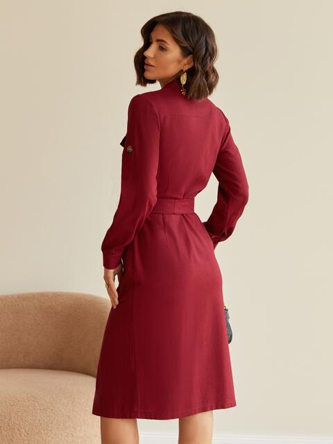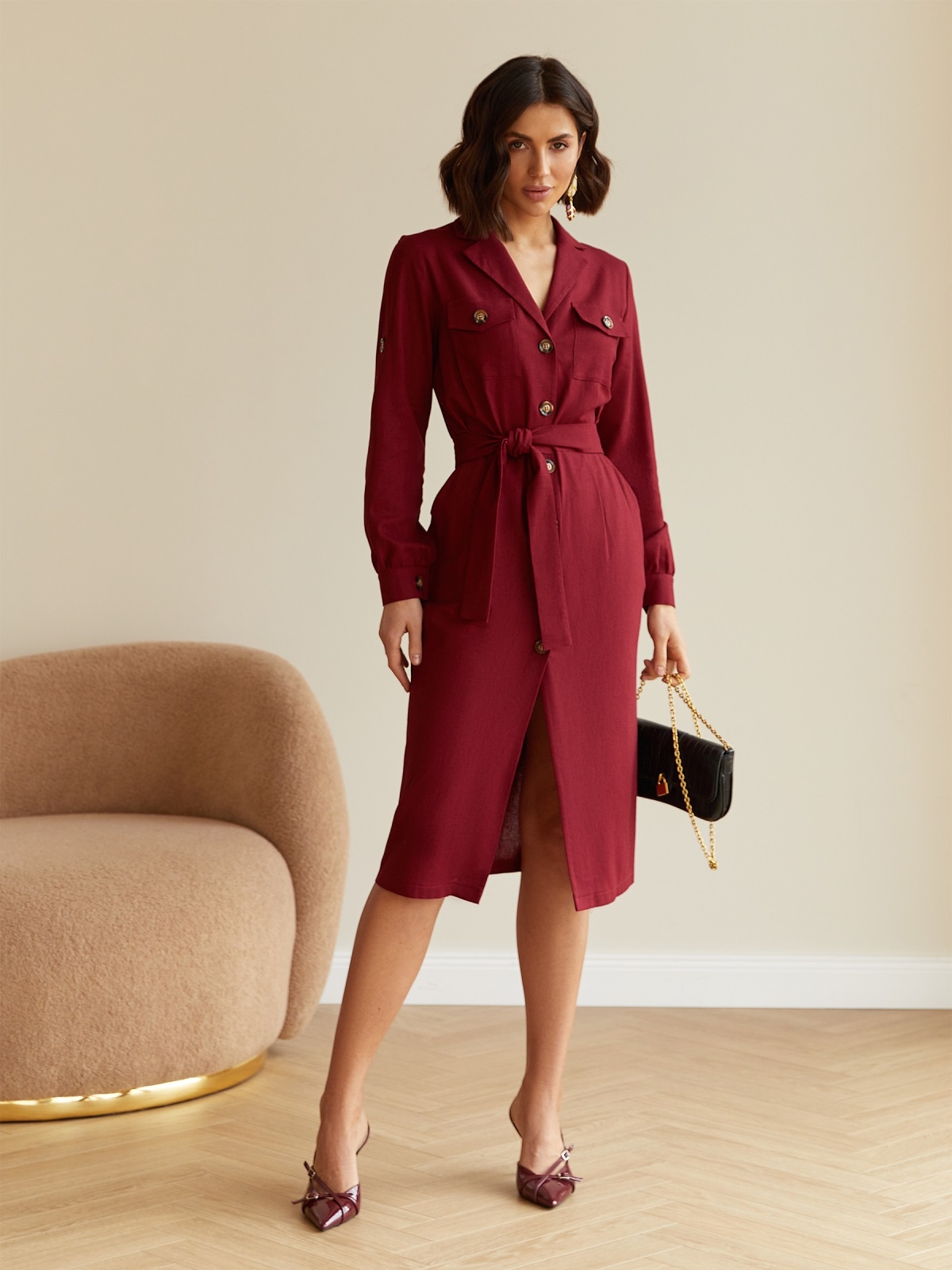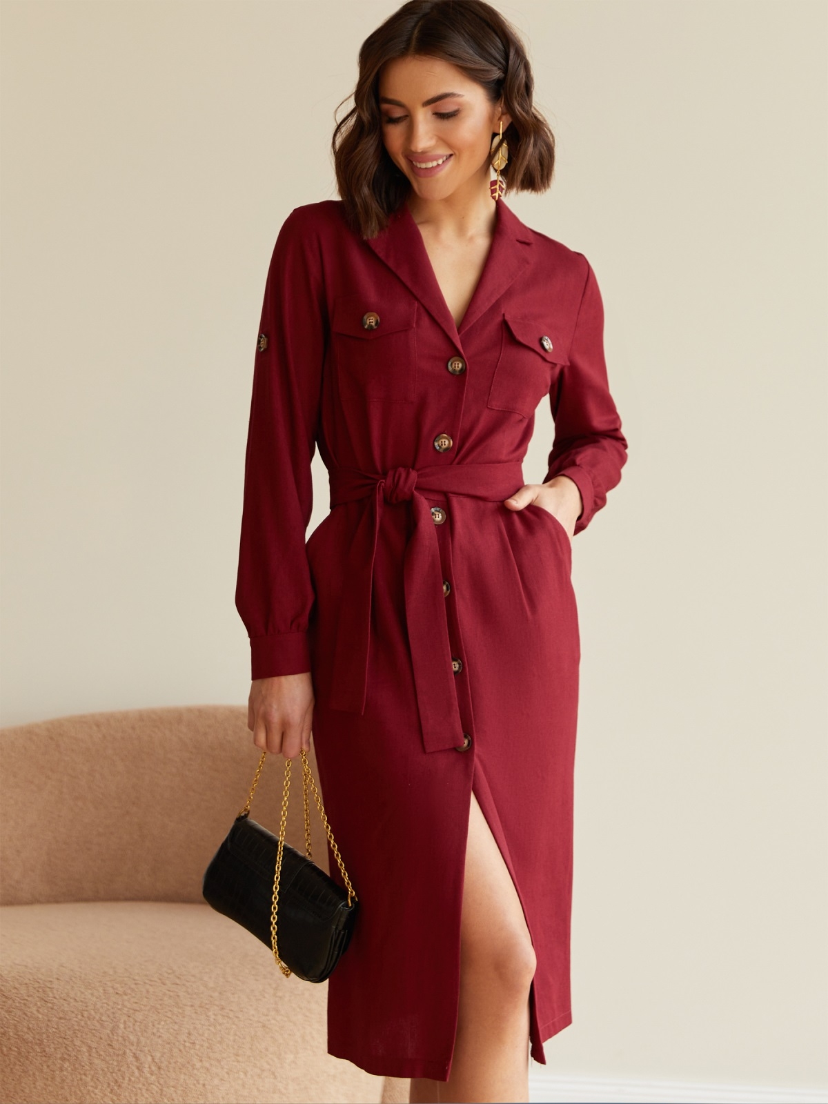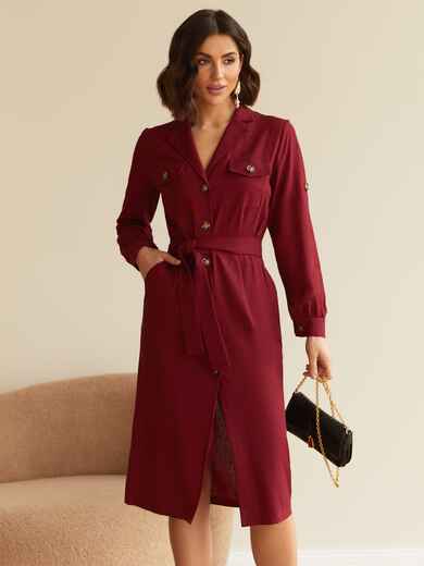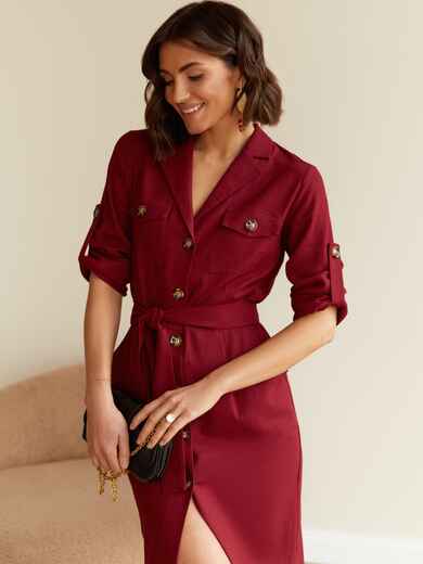 Лляне плаття злегка приталеного крою з коміром і нагрудними кишенями. Довжина рукавів регулюється шльовками. Застібається на ґудзики вздовж всієї довжини. Знімний пояс з основної тканини в комплекті.