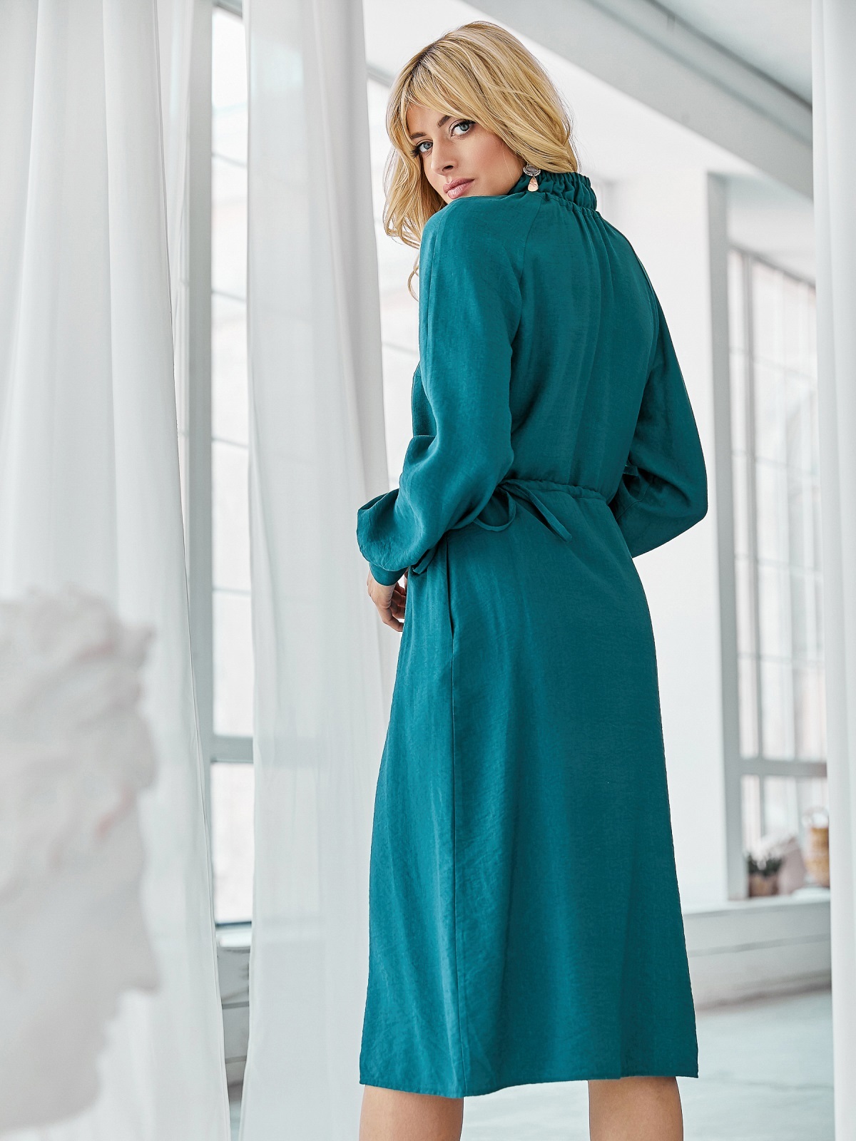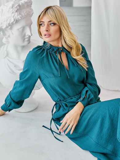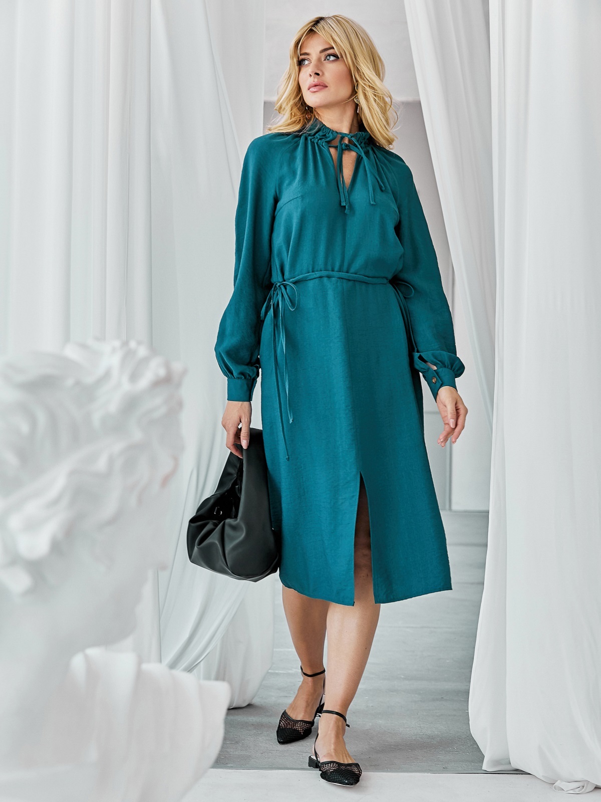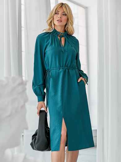 Сукня з куліскою в поясі та розрізом спереду . Модель з довгим рукавом-реглан і коміром на декоративних кулісках із зав'язками.